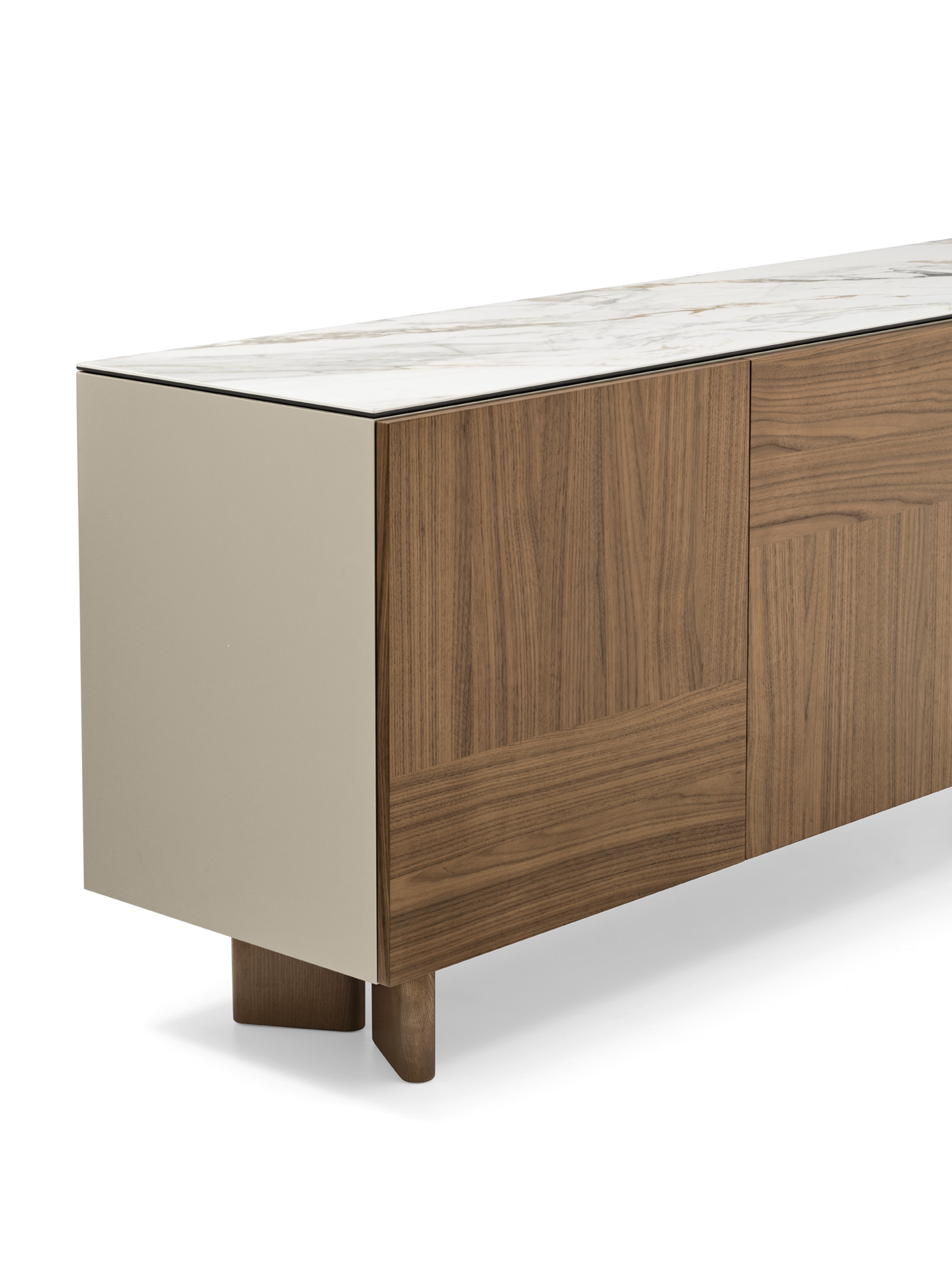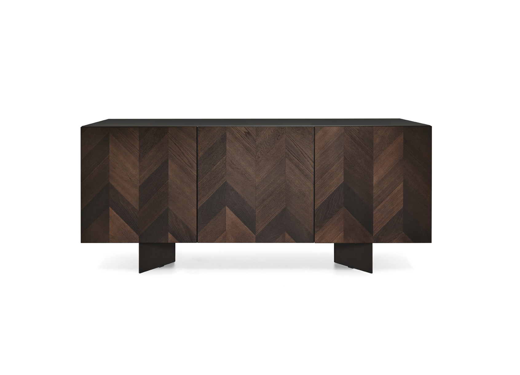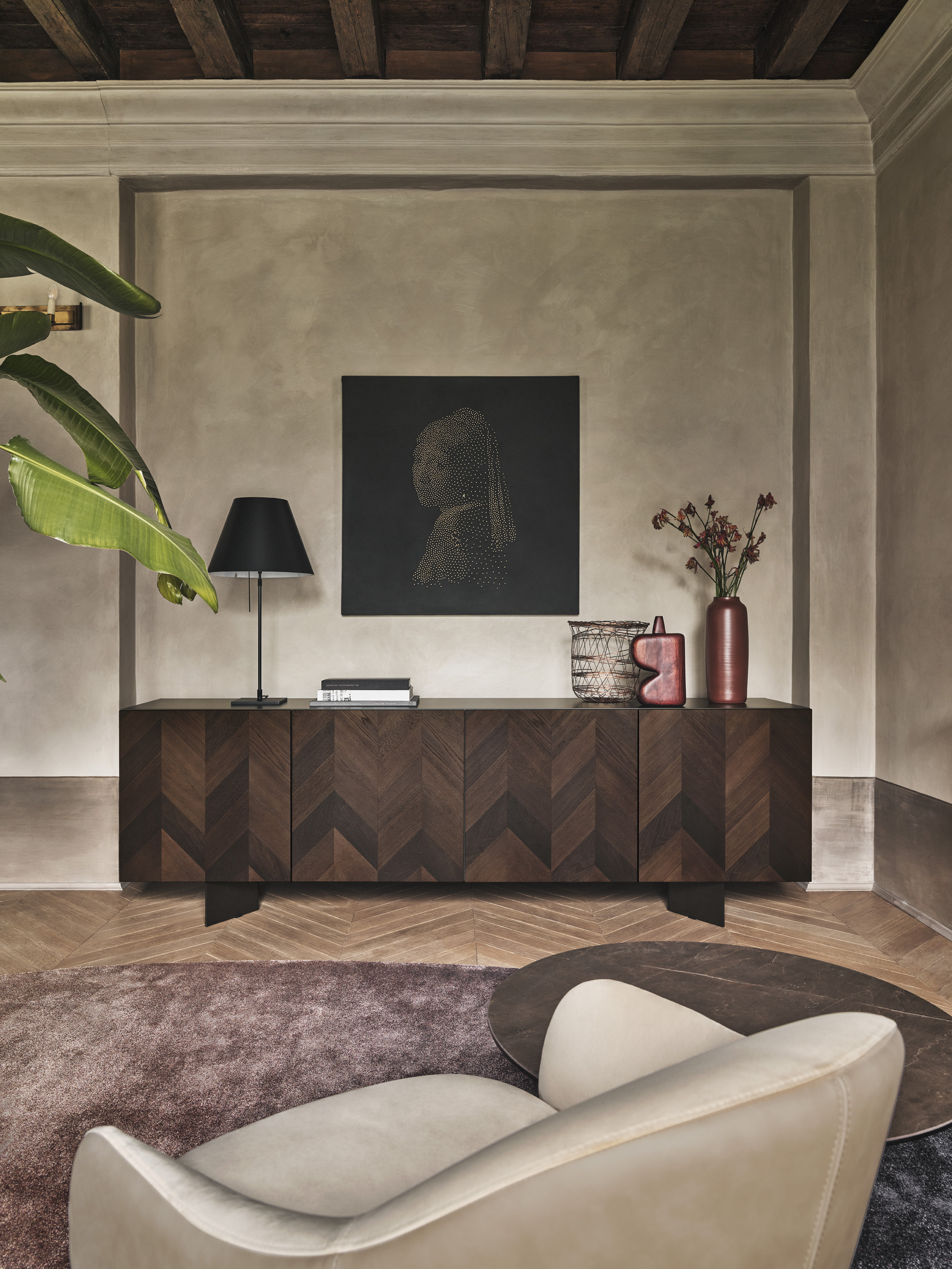 Projekt łączy prostą, minimalistyczną bryłę z wyrazistym detalem frontów. Geometryczny rysunek drewna nadaje komodzie charakter rzemieślniczego mebla, jednocześnie zachowując nowoczesną estetykę typową dla włoskiego wzornictwa.