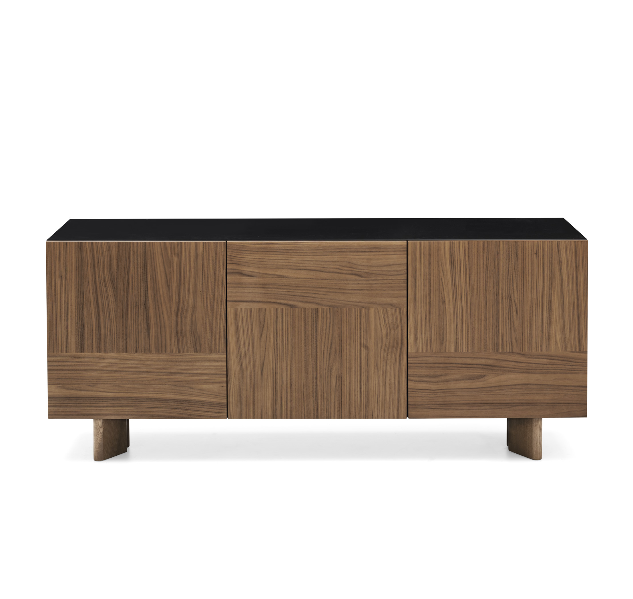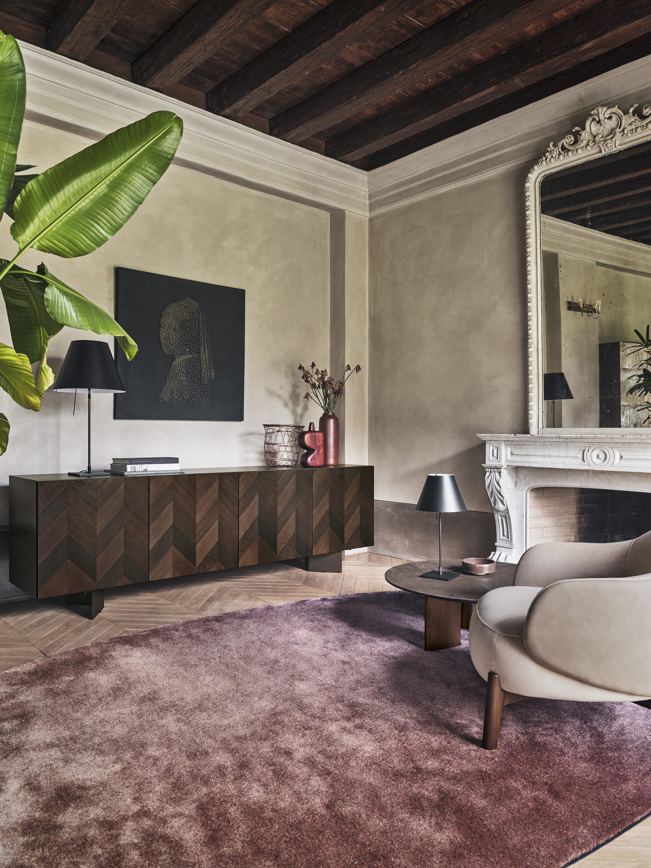 INTARSI została zaprojektowana jako element centralny aranżacji salonu lub jadalni. Smukła metalowa podstawa wizualnie odciąża bryłę i nadaje meblowi elegancję. Fronty pozbawione tradycyjnych uchwytów podkreślają czystą, architektoniczną formę.