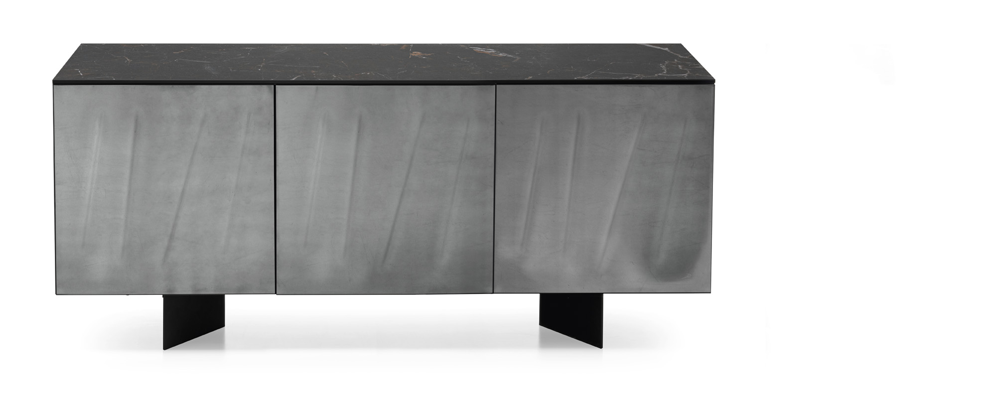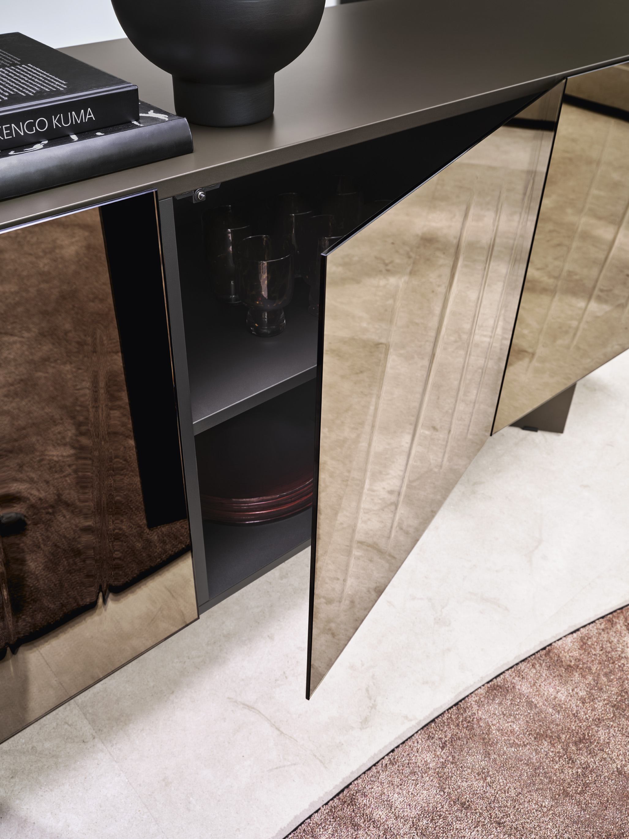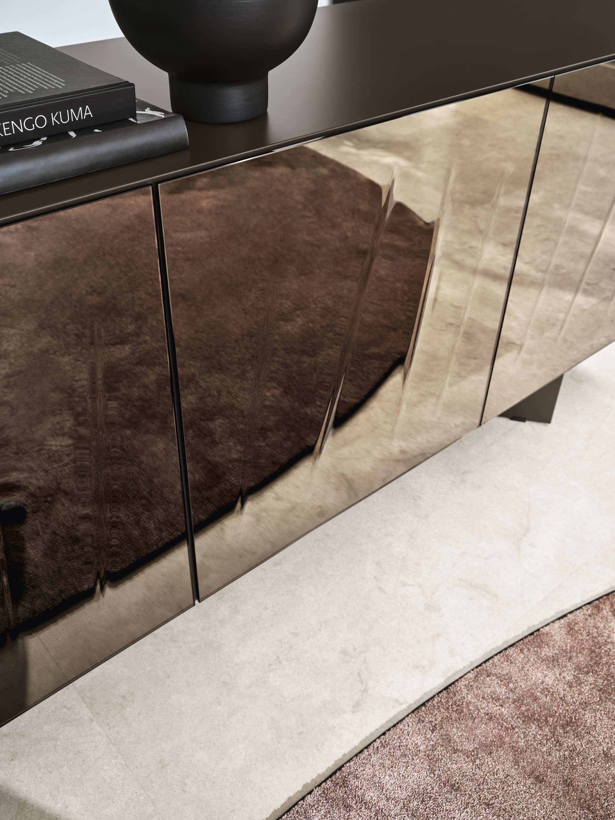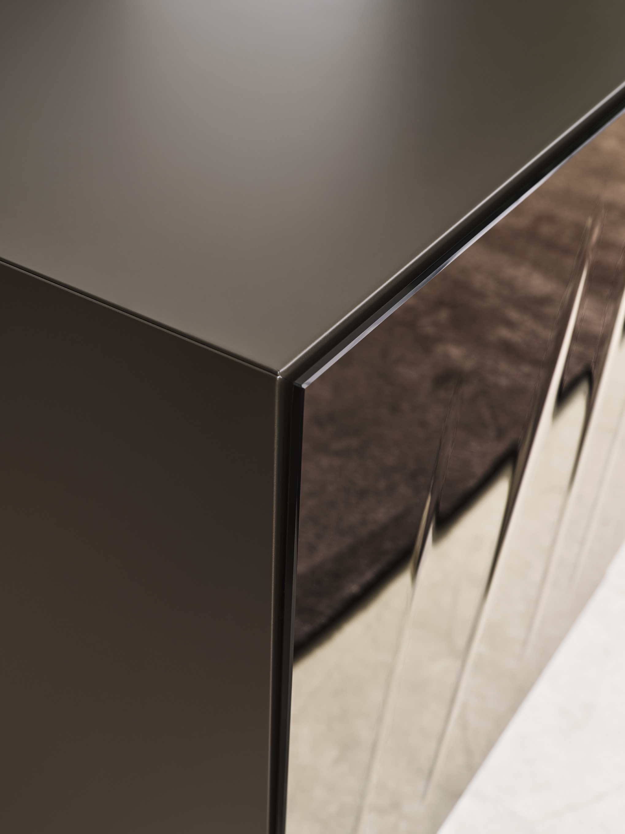Projekt inspirowany jest sztuką współczesną – powierzchnia lustrzana odbija otoczenie, dzięki czemu komoda wizualnie integruje się z przestrzenią, a pionowe nacięcia powodują efekt gry światła i cienia.