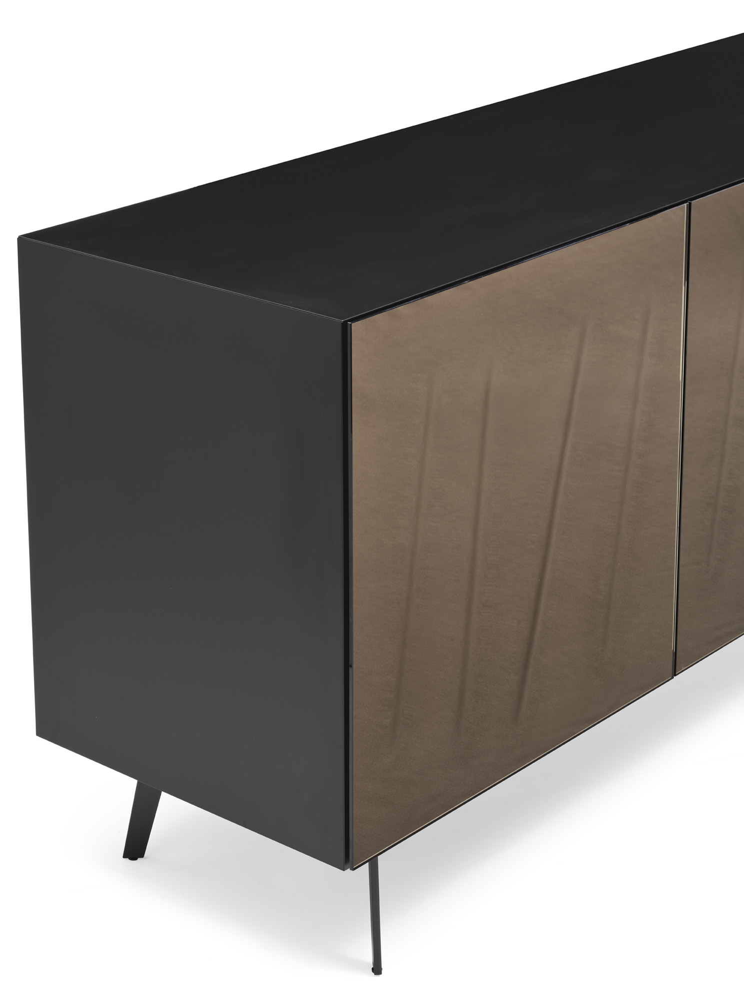 Komoda RITRATTI to nowoczesny kredens włoskiej marki Calligaris, zaprojektowany przez studio Buratti Architetti. Mebel wyróżnia się dekoracyjnymi frontami wykonanymi z lustra z pionowymi nacięciami, które tworzą charakterystyczną strukturę przypominającą relief.
