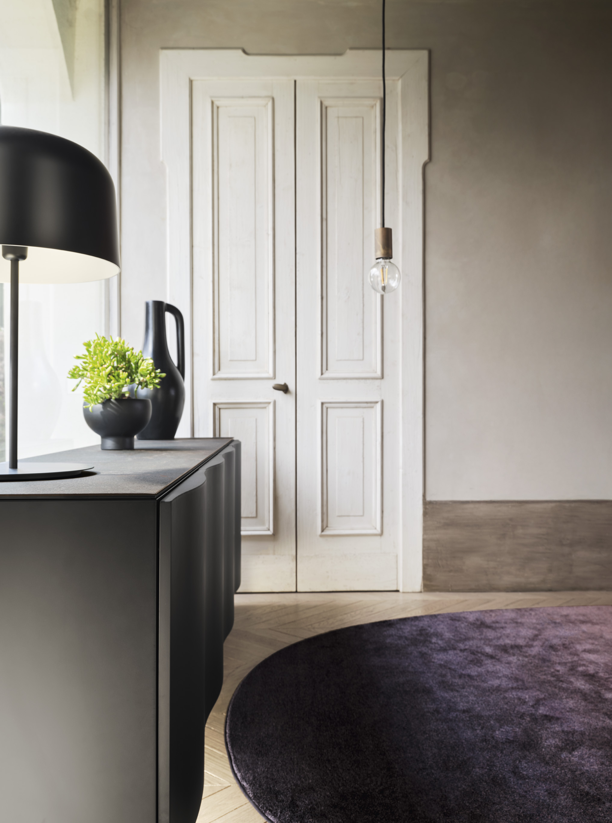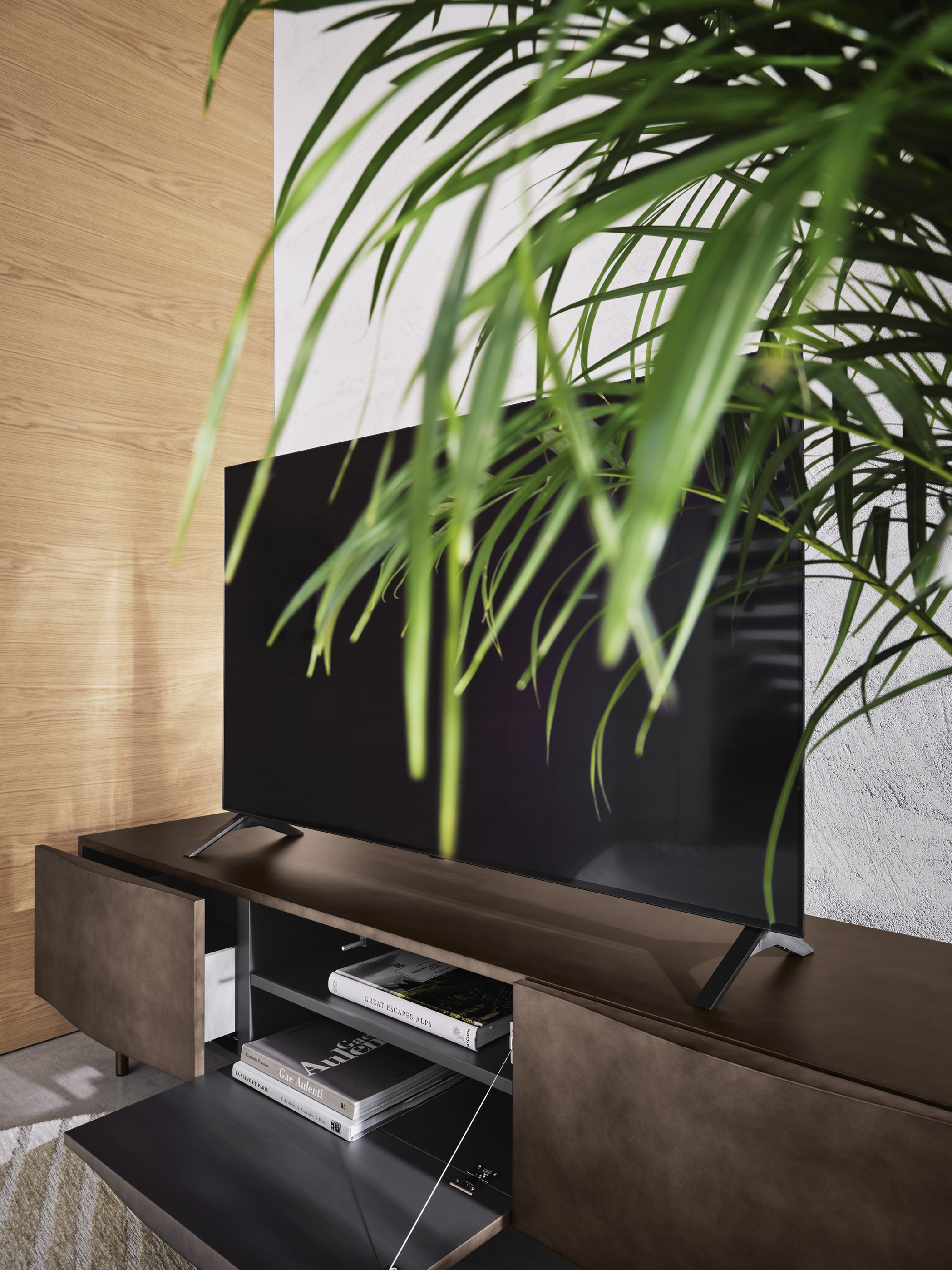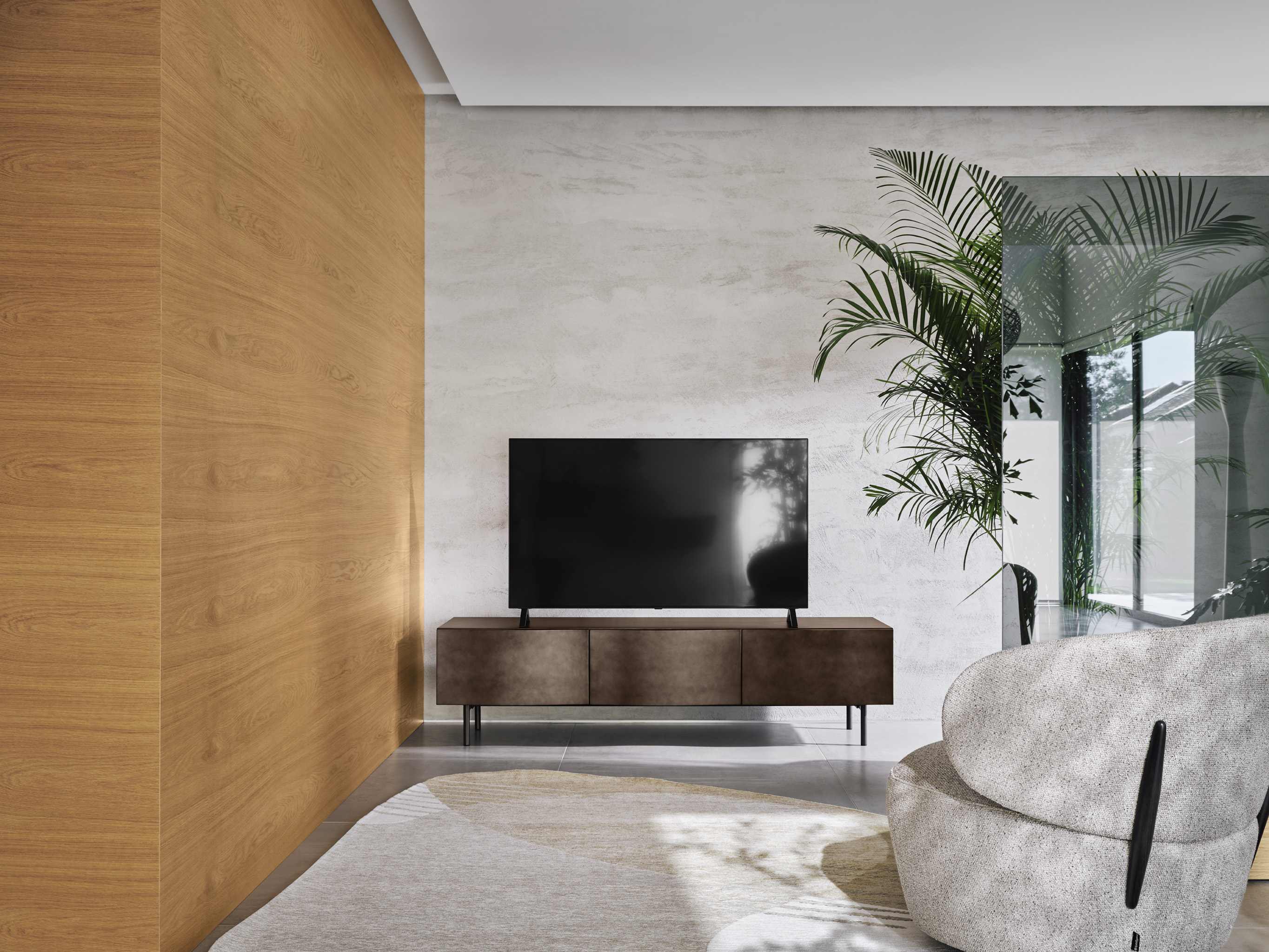 Fronty pozbawione są uchwytów – zastosowano system push-pull, który pozwala otworzyć drzwi lekkim naciśnięciem. Smukła podstawa unosi korpus nad podłogą, co optycznie wysmukla bryłę i nadaje meblowi elegancji.