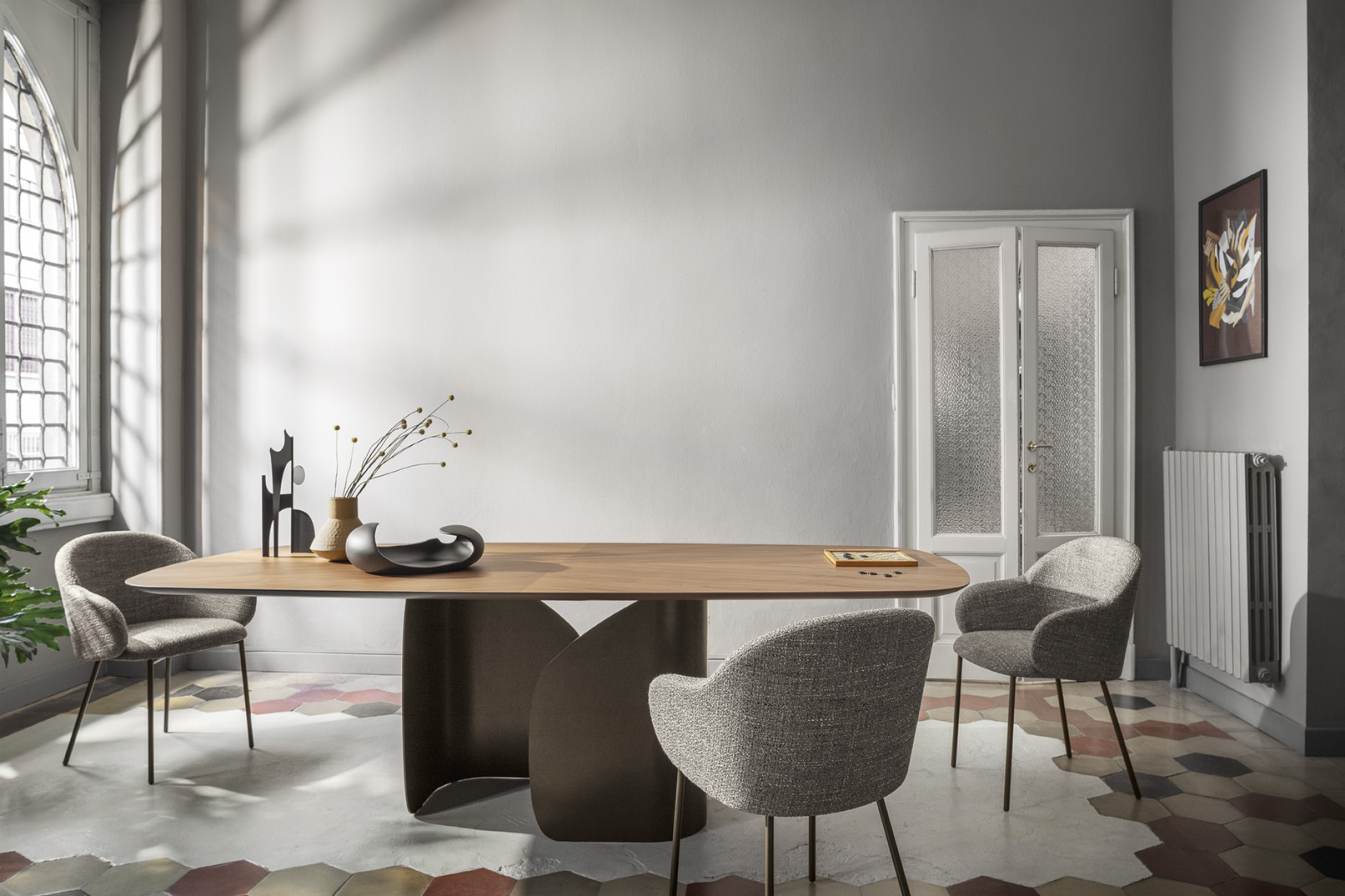 Styl: elegancki kontrast bazy i siedziska, geometryczne linie, wysokiej jakości materiały.