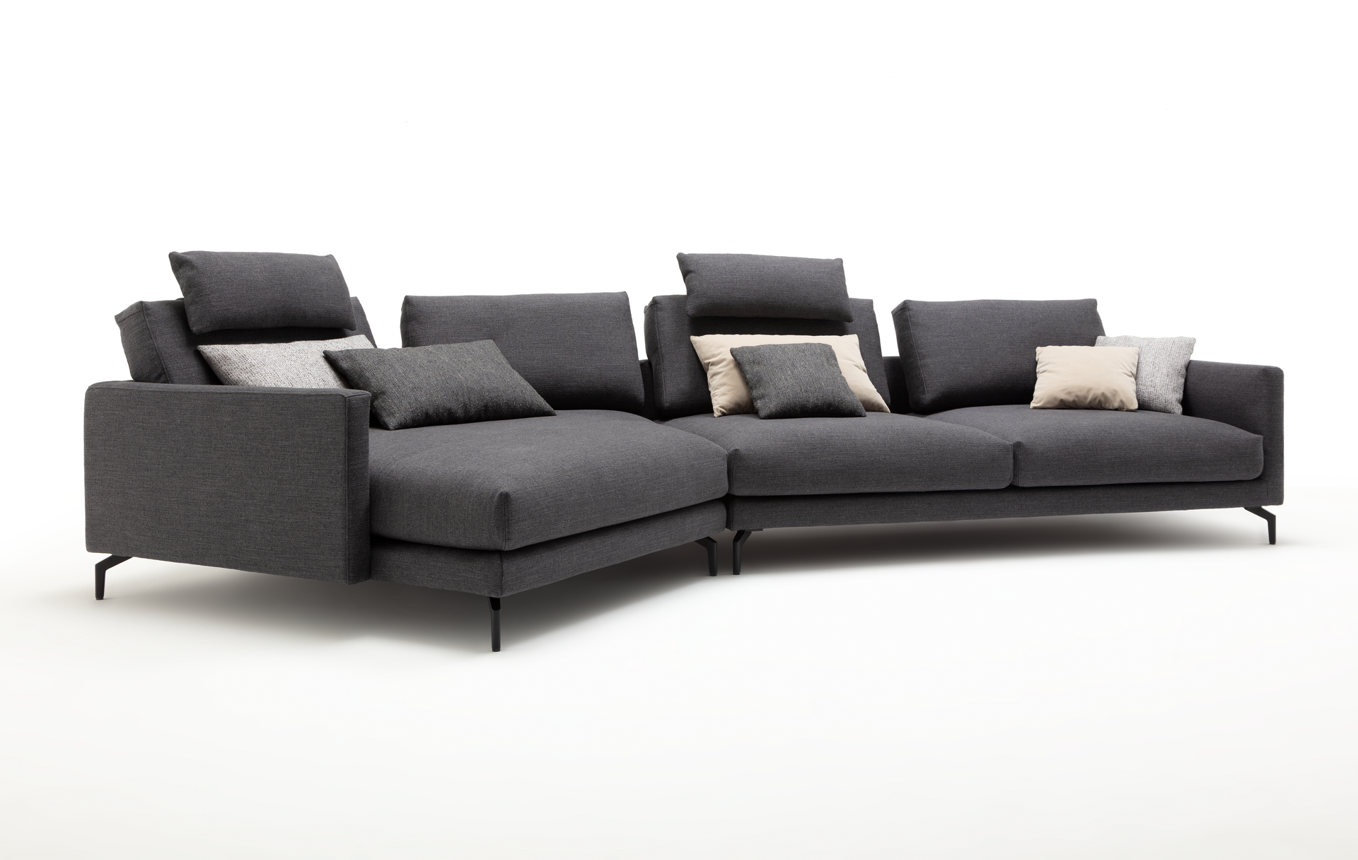 Komfort sofy ROLF BENZ JOLA w dużej mierze jest budowany przez dobór poduszek oparciowych, które występują w różnych rozmiarach, w tym specjalnie zaprojektowana poducha funkcyjna, z ruchomym, bardzo estetycznym zagłówkiem.