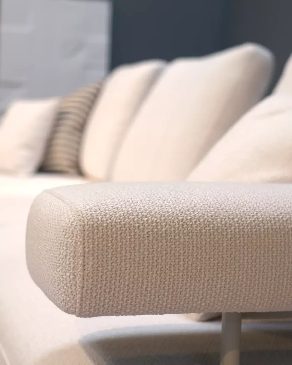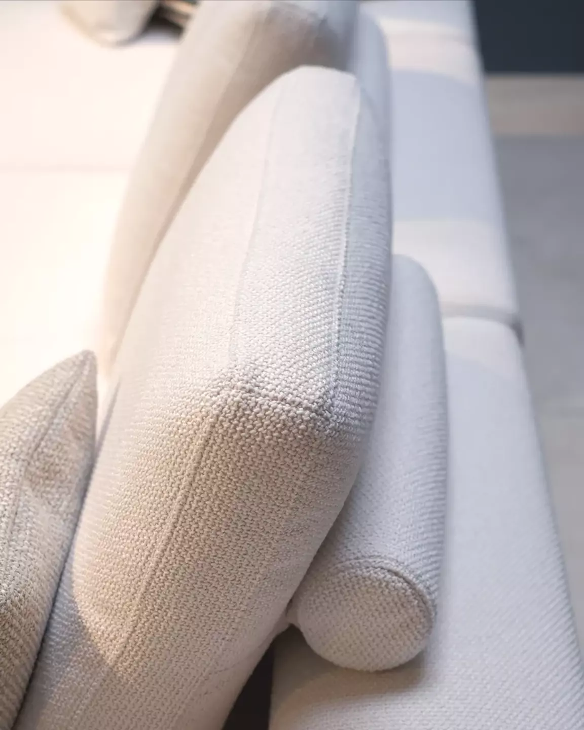 Przezroczystość i lekkość formy: między poduszkami a ramą widoczna przerwa, co daje wrażenie „unoszenia się” mebla w przestrzeni.