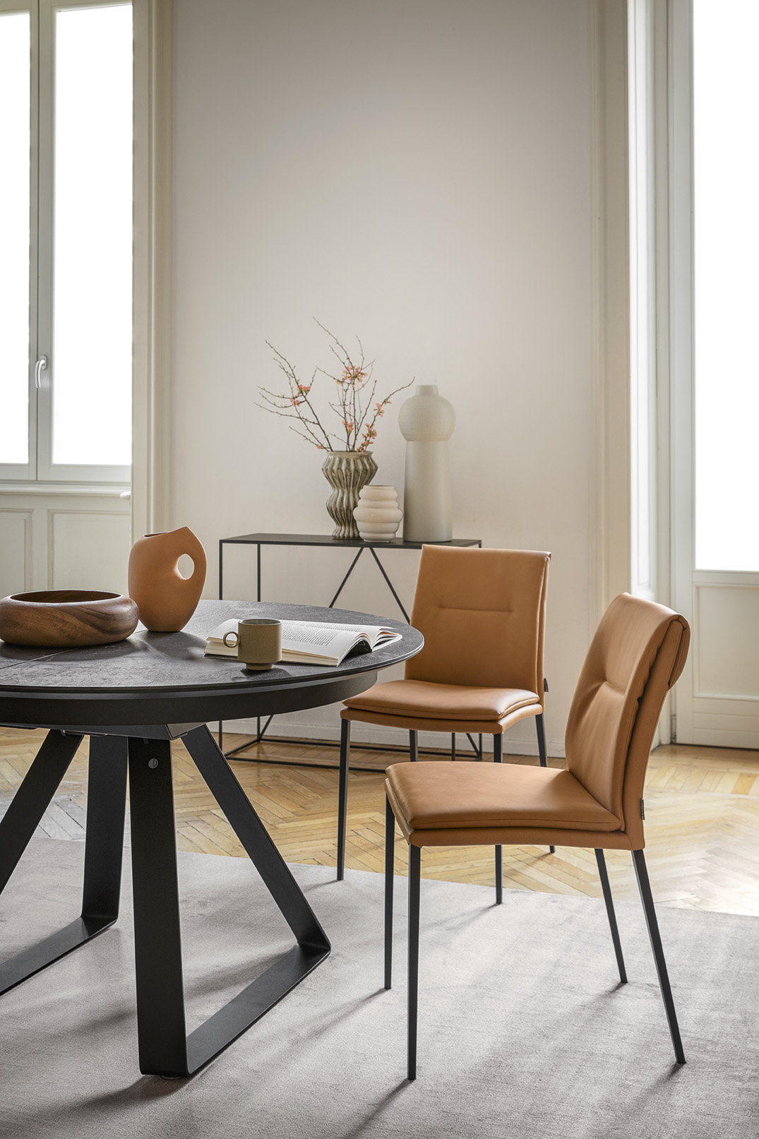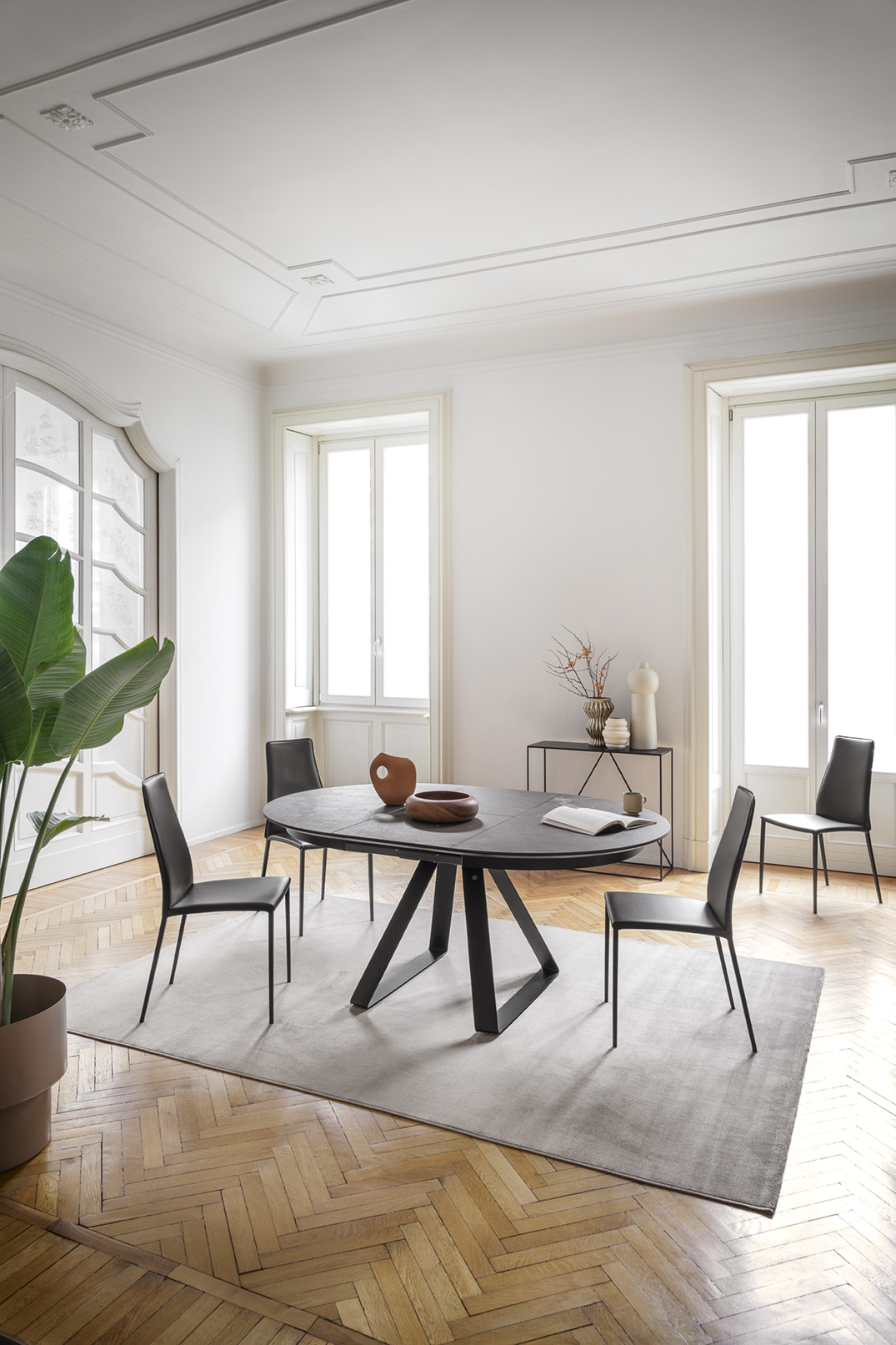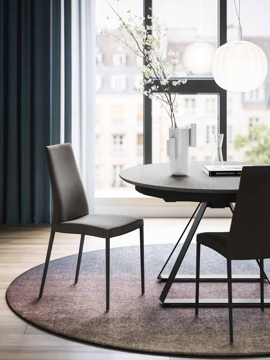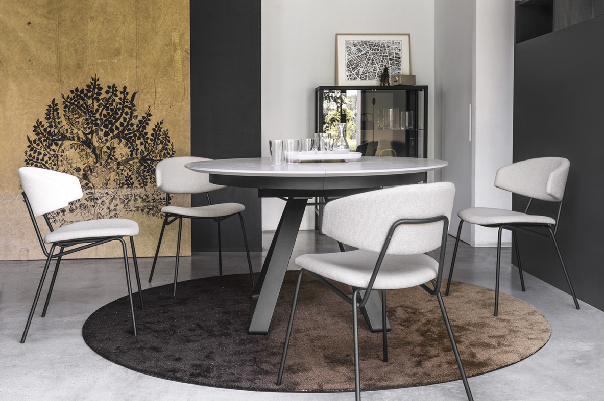 Atlante to stół jadalniany włoskiej marki Calligaris o bardzo czystej, nowoczesnej formie. Jego znakiem rozpoznawczym jest centralna metalowa podstawa i okrągły blat, dzięki czemu wokół stołu nie ma nóg ograniczających miejsce na krzesła.