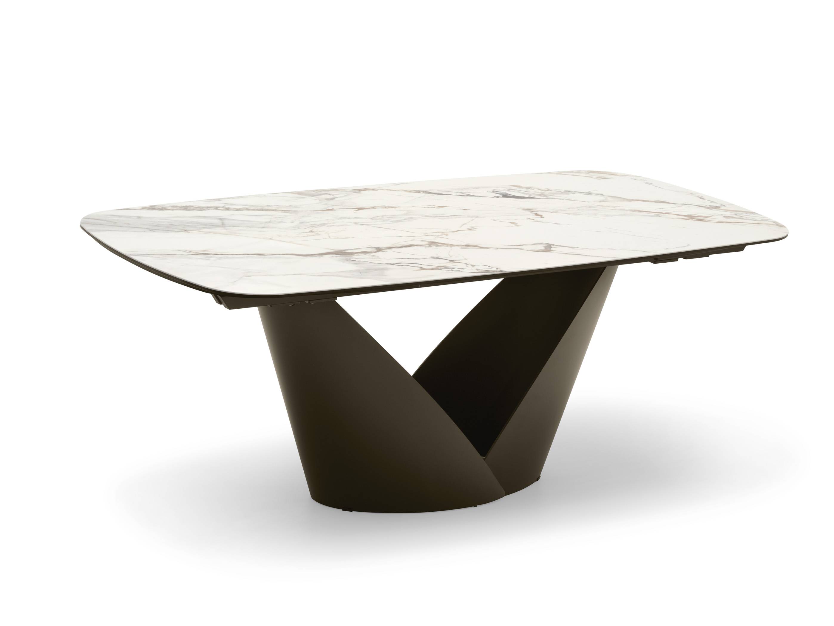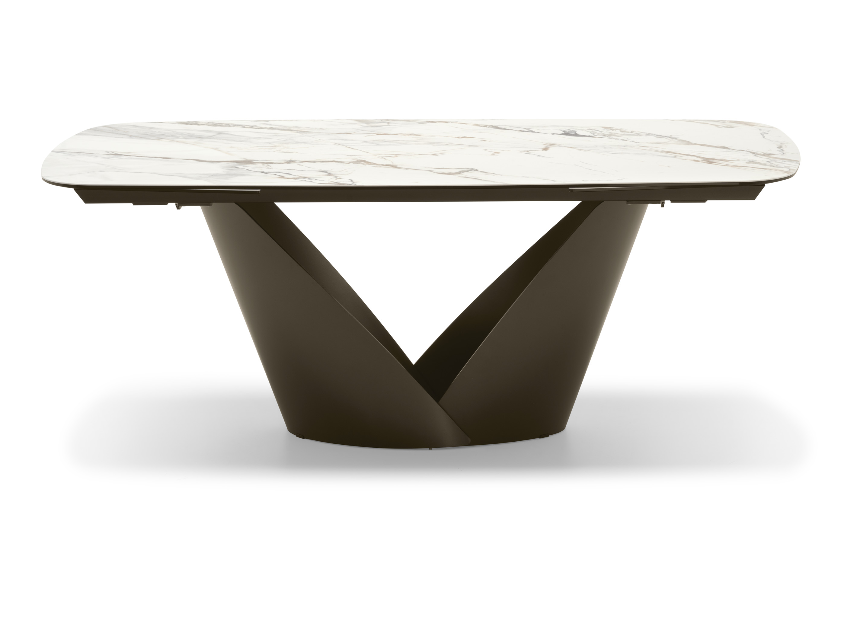 Calla to designerski stół jadalniany marki Calligaris dostępny także w wersji rozkładanej z centralną metalową podstawą. Jego najbardziej charakterystycznym elementem jest podstawa przypominająca płatki kwiatu, złożona z dwóch wygiętych metalowych elementów, które przenikają się i tworzą formę kielicha.