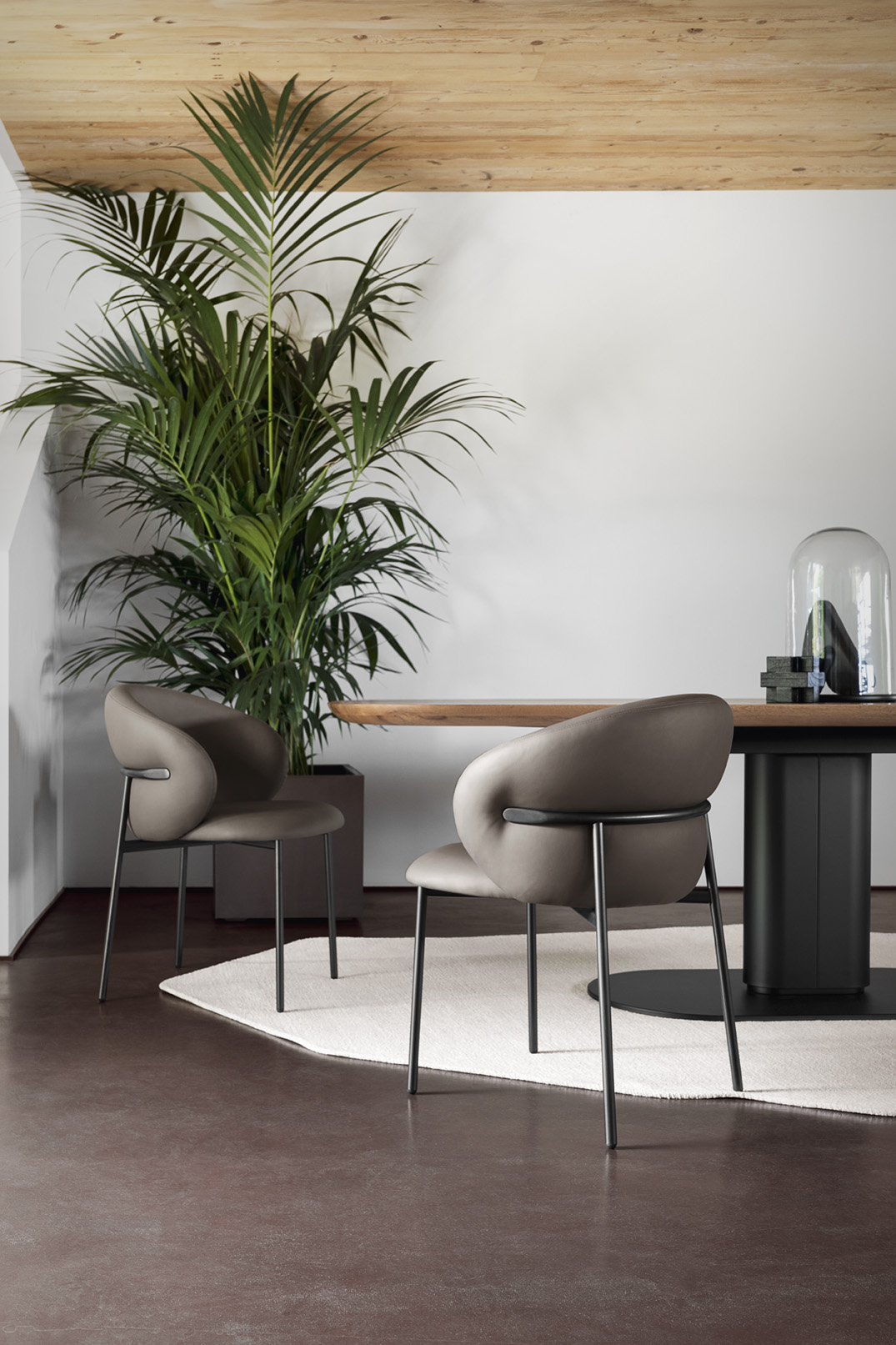 Cameo to jeden z bardziej eleganckich stołów w kolekcji Calligaris. W wersji z prostokątnym blatem ma charakterystyczną centralną podstawę w formie owalnej kolumny z metalową płytą przy podłodze, dzięki czemu wygląda bardzo rzeźbiarsko i nowocześnie.