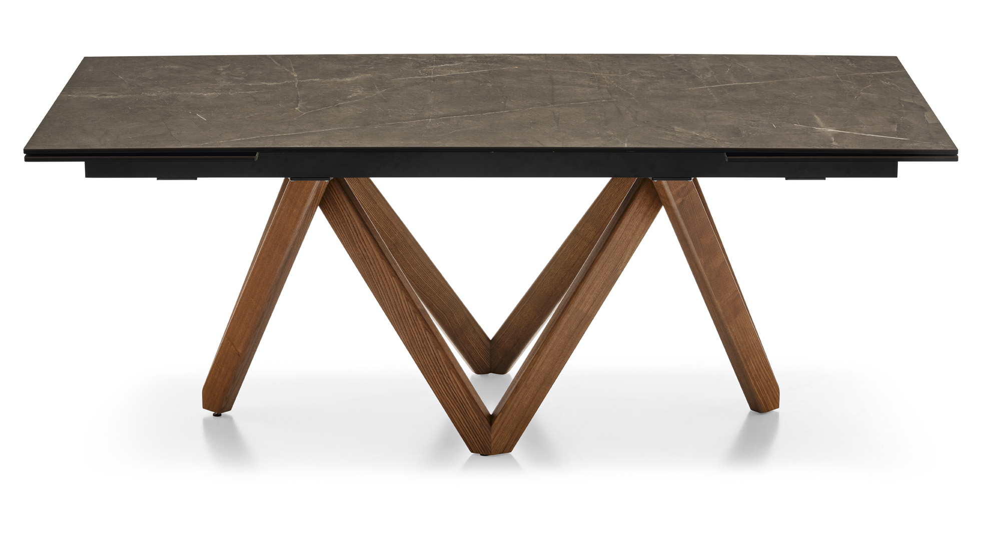 Składa się z czterech elementów w kształcie litery „V”, które krzyżują się pod blatem i tworzą rzeźbiarską konstrukcję.