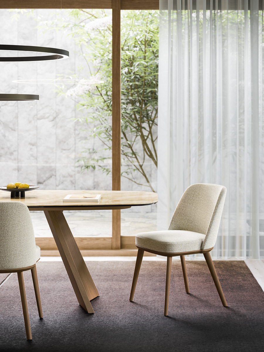 ICARO w wersji z owalnym blatem to elegancki, rzeźbiarski stół jadalniany, który łączy miękką linię formy z wyrazistą, designerską podstawą. Zaprojektowany przez studio Archirivolto dla Calligaris, przyciąga uwagę dynamiczną konstrukcją nóg z drewna, inspirowaną skrzydłami – lekką wizualnie, a jednocześnie bardzo stabilną.