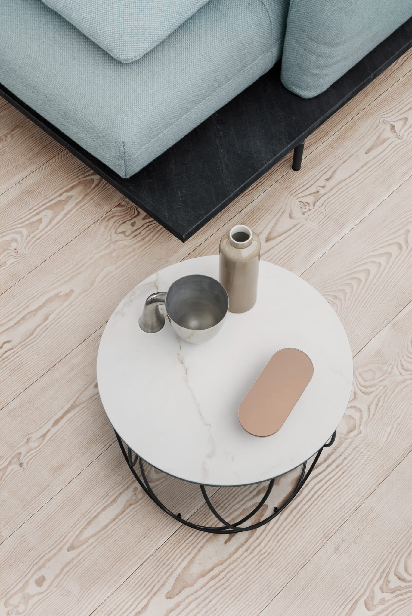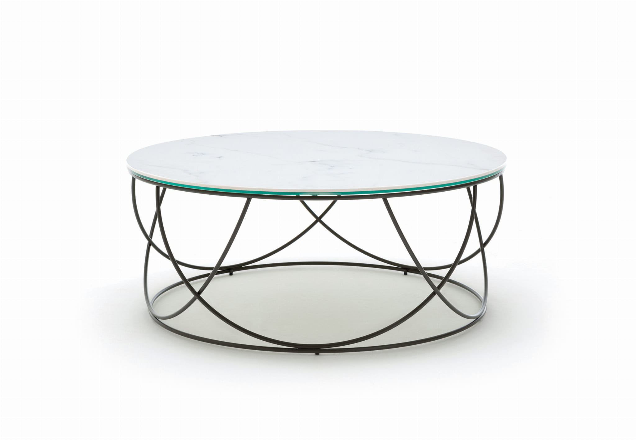 Okrągły stolik kawowy na stalowej podstawie, z białym ceramicznym blatem Calacatta.