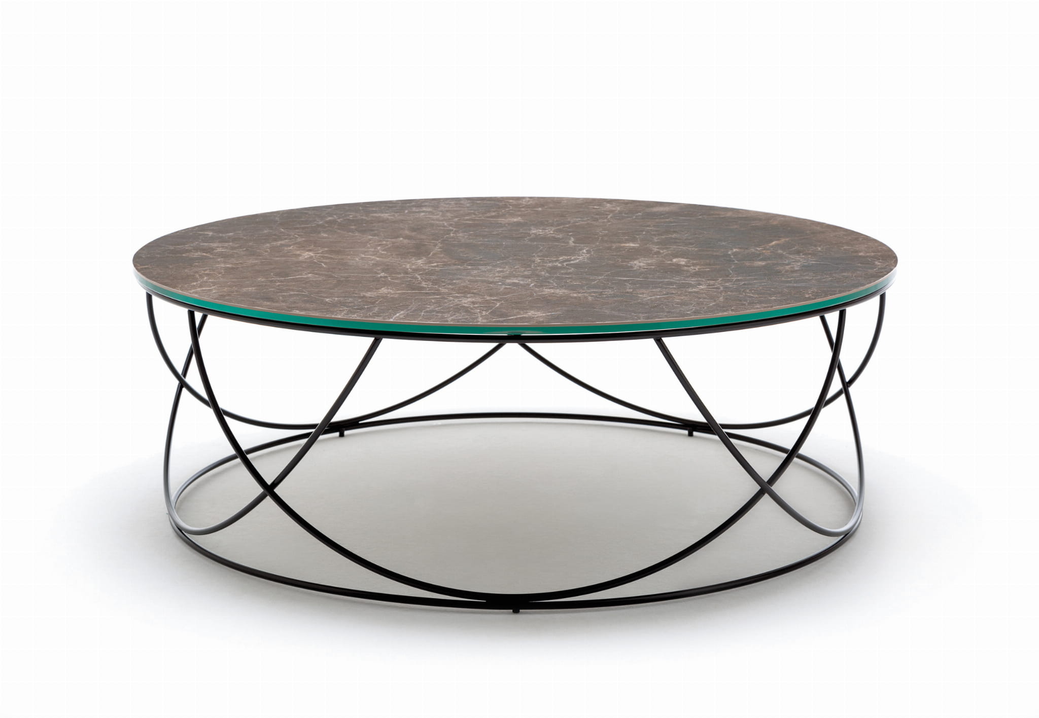 Okrągły stolik kawowy na stalowej podstawie, z ceramicznym blatem Emperador.