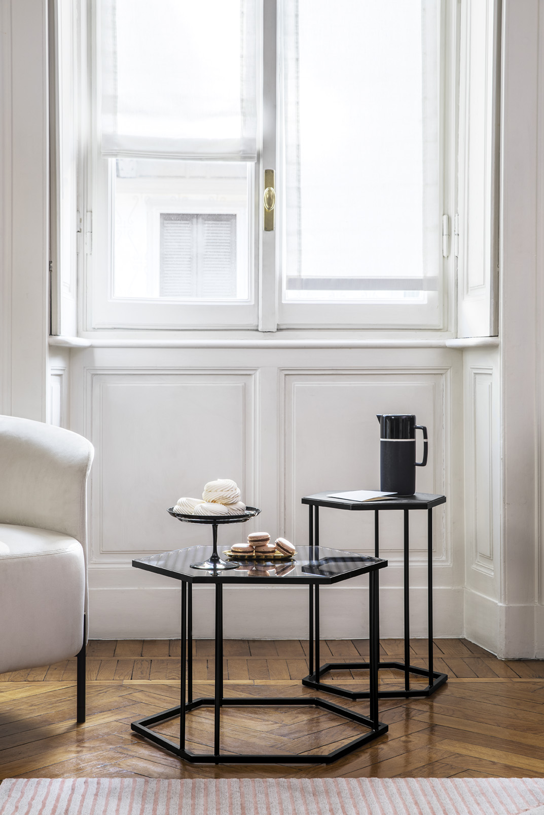 Projekt zakłada lekkość formy, proporcje dostosowane do strefy wypoczynkowej oraz uniwersalne wymiary, które dobrze współgrają z kanapami i fotelami o standardowej wysokości. Stoliki z kolekcji Renee mogą być używane pojedynczo lub w zestawach, dzięki czemu łatwo je dopasować do przestrzeni salonu.
