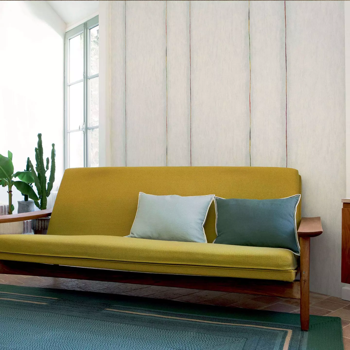 Kolorystyka łączy delikatne, naturalne beże z akcentami miodowej żółci i zieleni. Wzór jest subtelny i elegancki – delikatne pionowe pasy lub przejścia tonalne, które wprowadzają wrażenie miękkości i naturalnego światła.