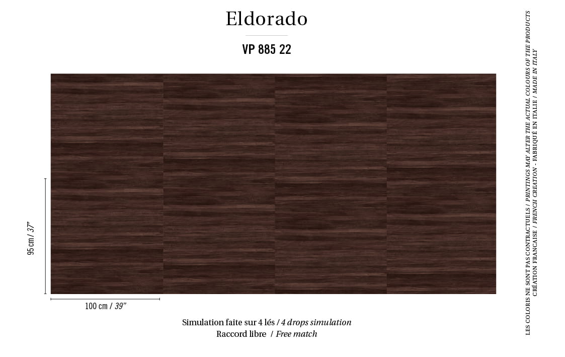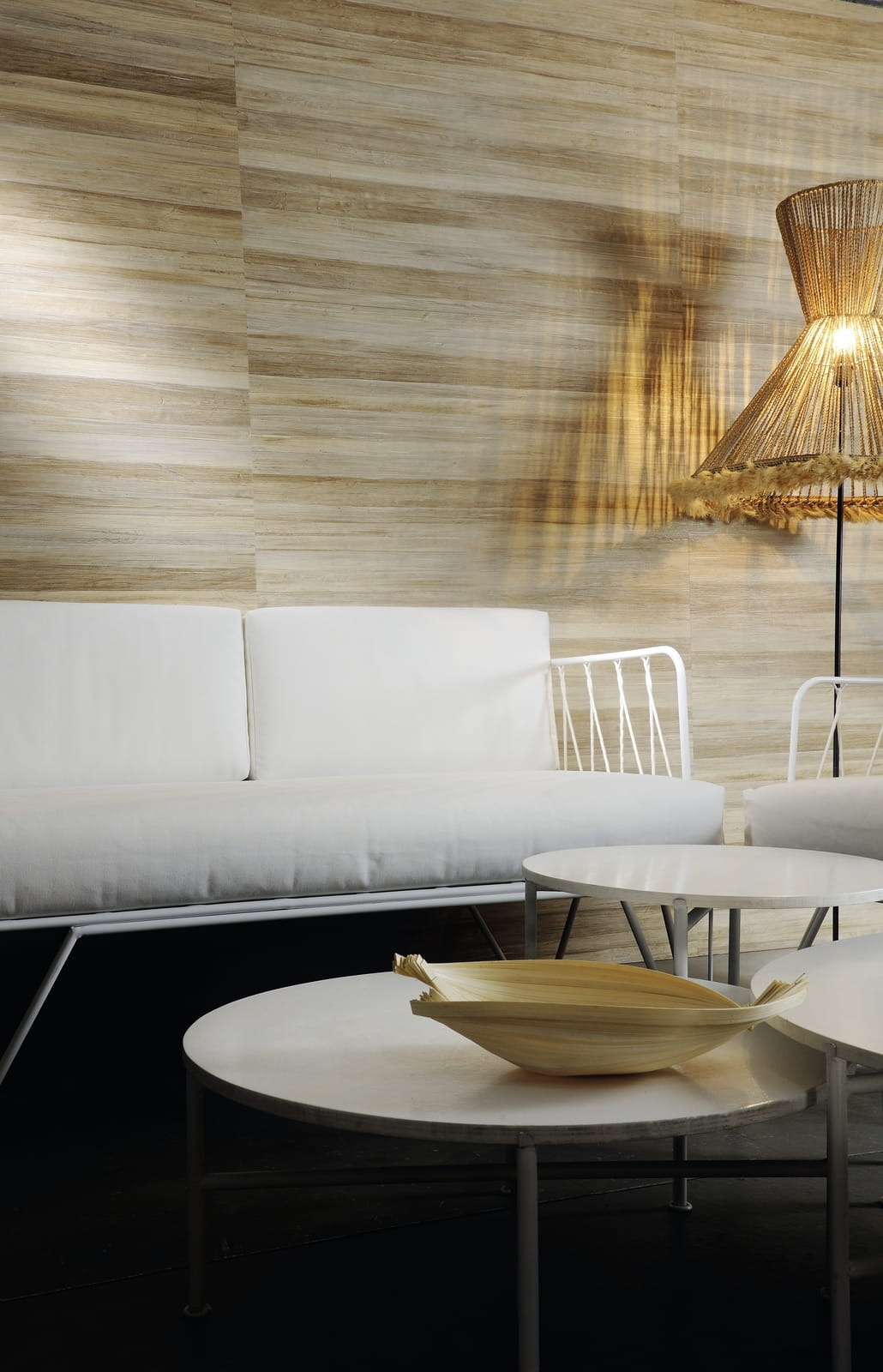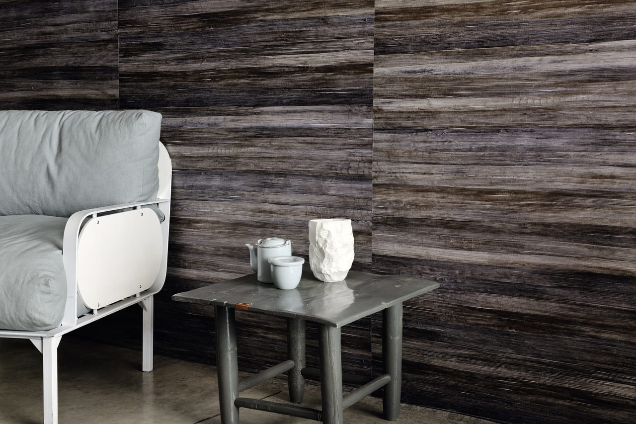 Zdumiewająca struktura drewna, wykonanych tak precyzyjnie, że trzeba jej dotknąć! Usłojenie drewna jest ułożone poziomo, sąsiadujące pasy mogą być dopasowane zgodnie z wzorem, tworząc jednolitą kontynuację przez całą ścianę lub świadomie "nie pilnowane", podkreślając naturalny efekt poszczególnych brytów okleiny. W zależności od koloru tapeta pozwala na osiągnięcie różnych efektów stylistycznych.