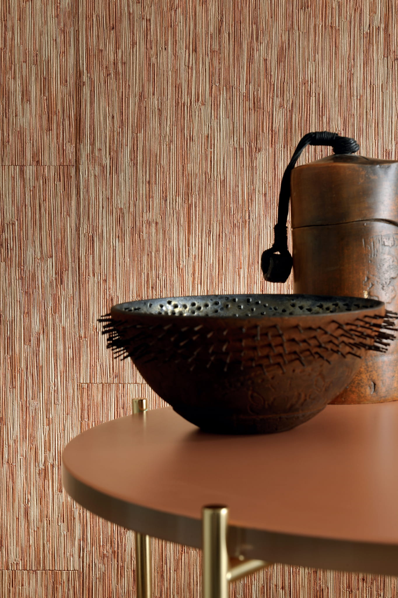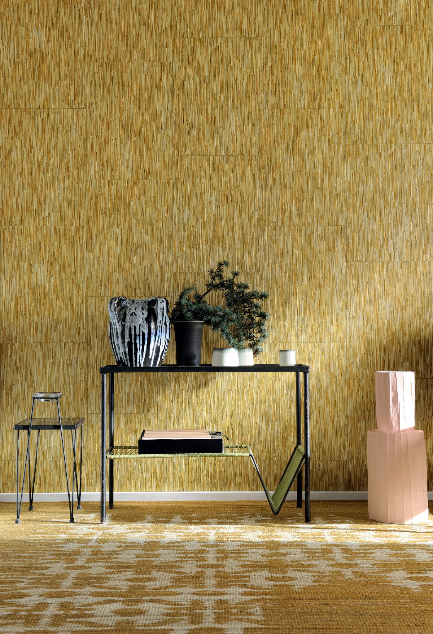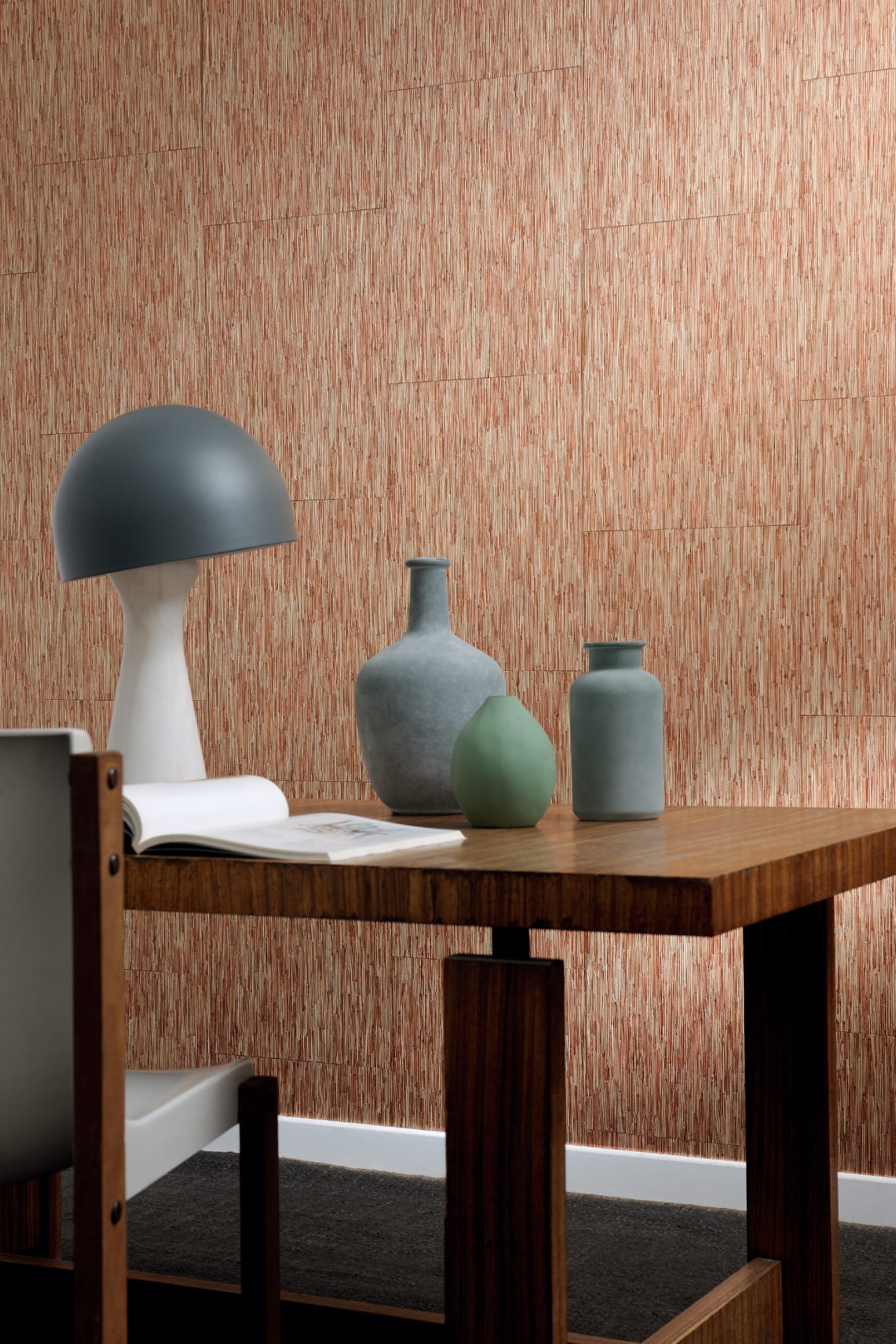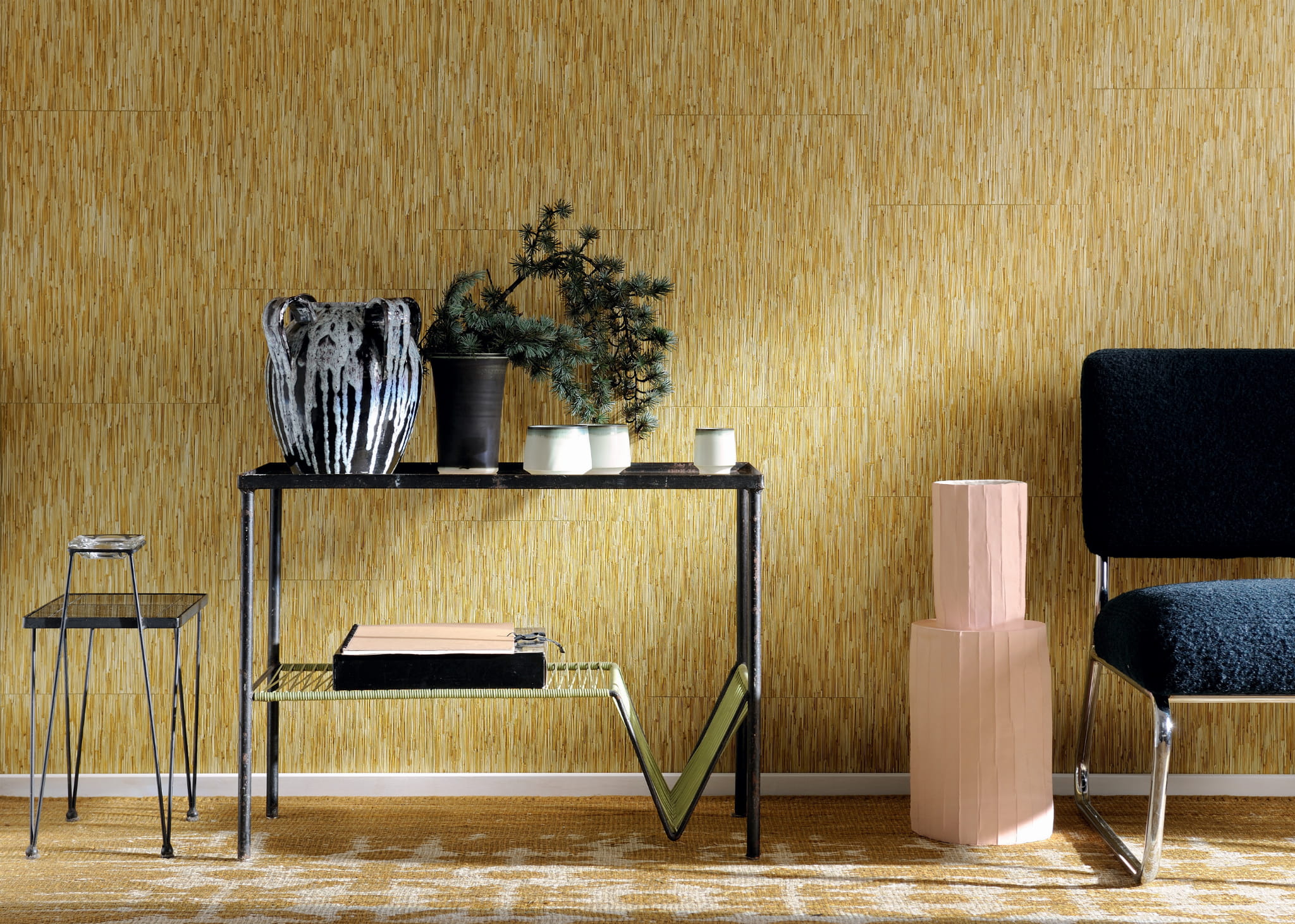 Faktura wręcz wyrafinowana, dwukolorowa słomka o bardzo naturalnym efekcie. Tapeta występuje również w wersji z zatopionymi drobinkami metali, co działa magicznie z grą światła, tworząc efekt wypukły, połyskujący wręcz opalizujący.