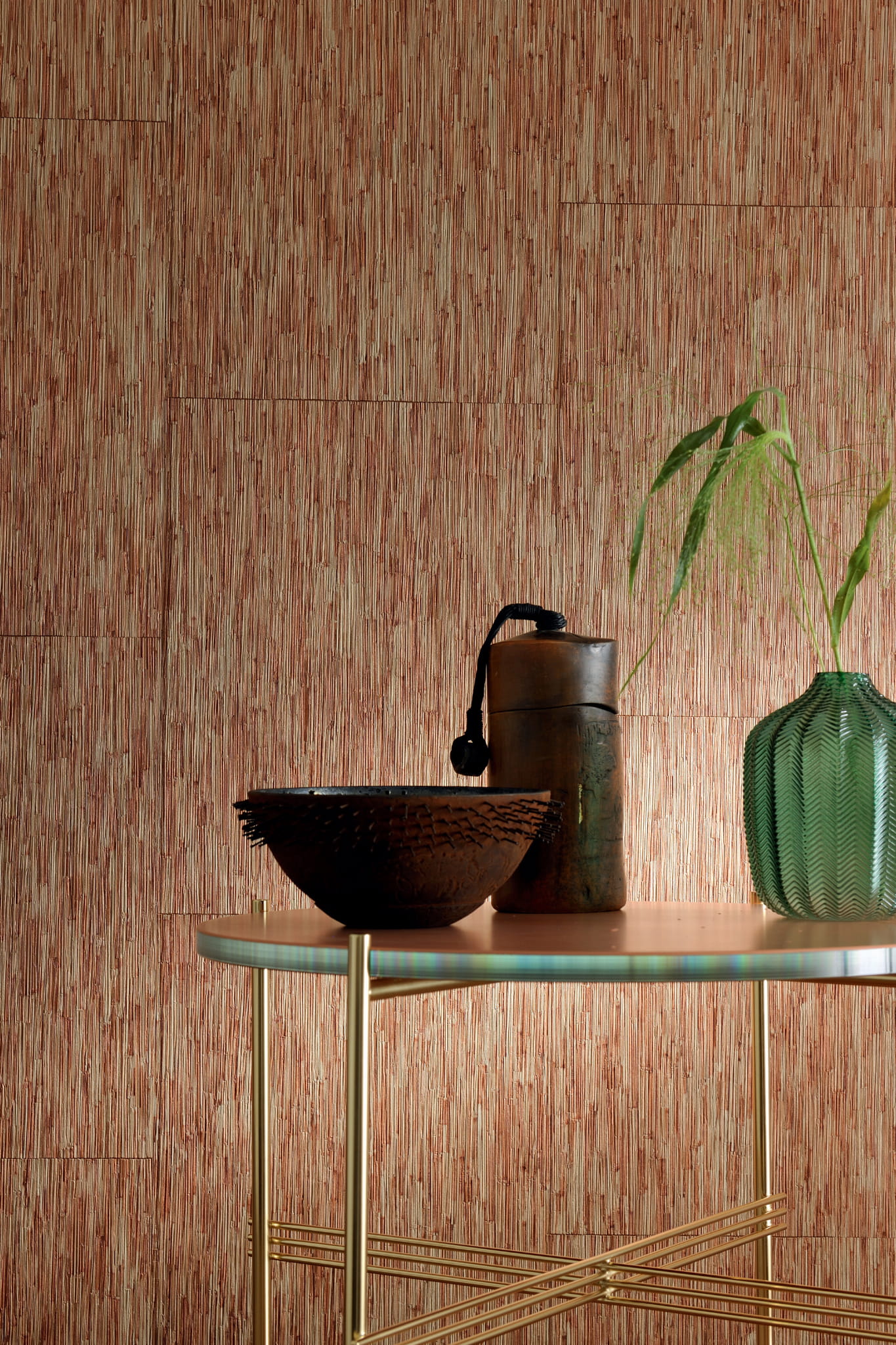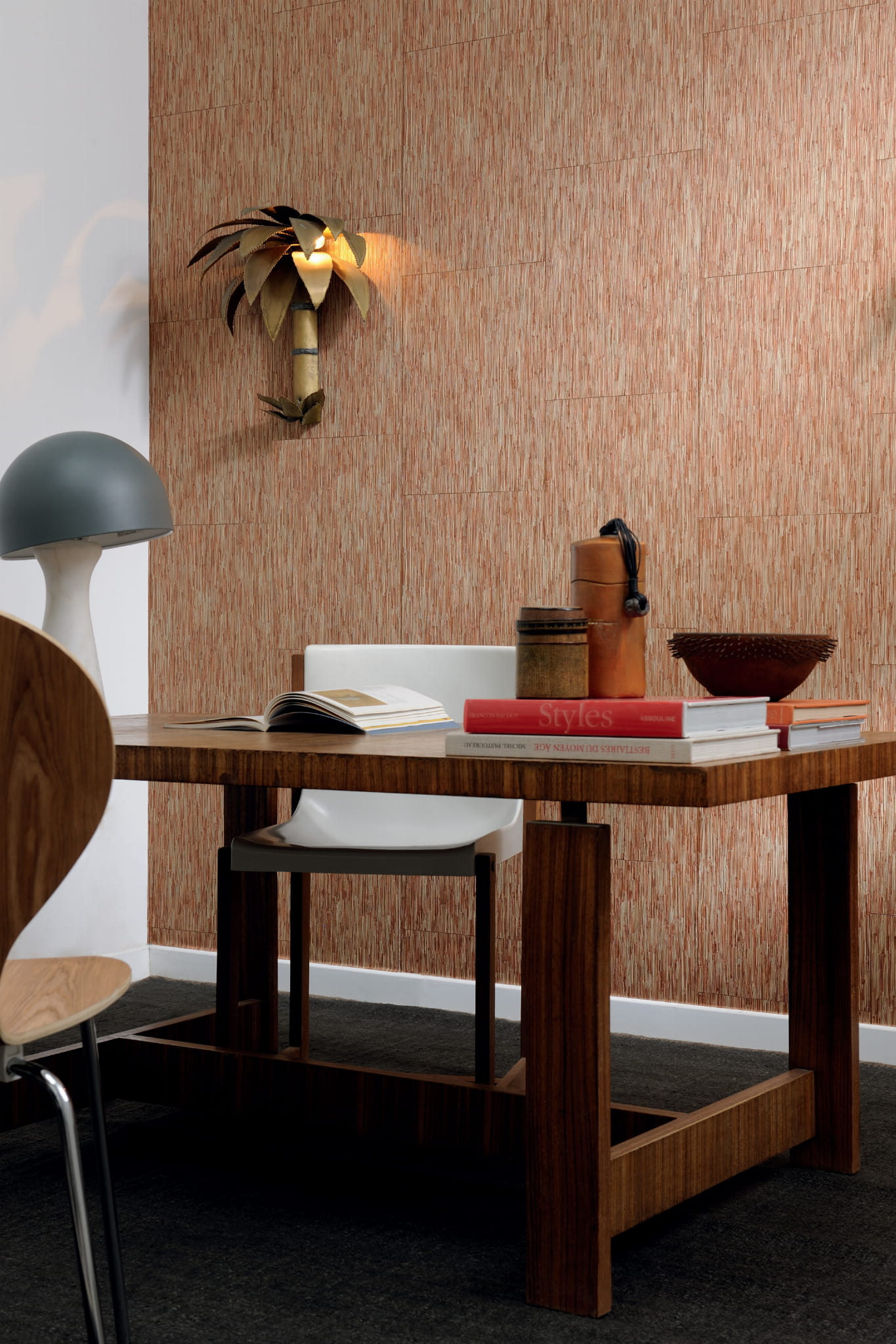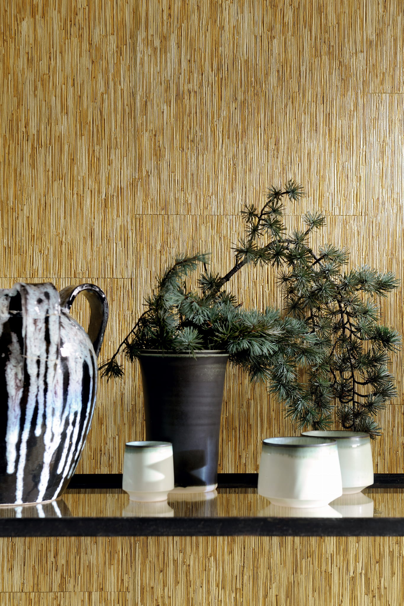 Faktura wręcz wyrafinowana, dwukolorowa słomka o bardzo naturalnym efekcie. Tapeta występuje również w wersji z zatopionymi drobinkami metali, co działa magicznie z grą światła, tworząc efekt wypukły, połyskujący wręcz opalizujący.
