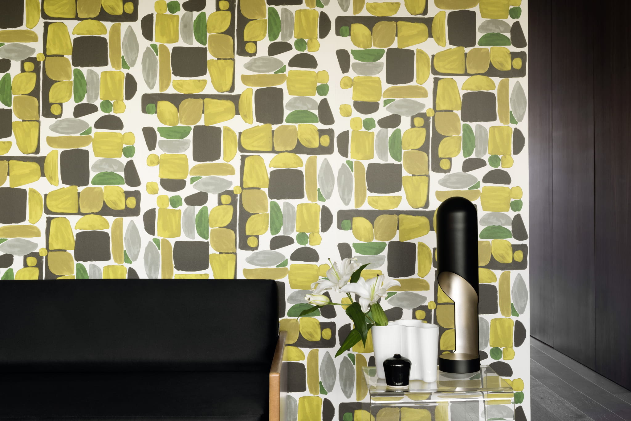 Wzór dość figlarny, zbiór form kamyków, rzekomo poukładanych, na dużej przestrzeni działa bardzo energetycznie. Pokazana w kontrastowych, mocnych i żywych kolorach pobudza naszą wyobraźnię.