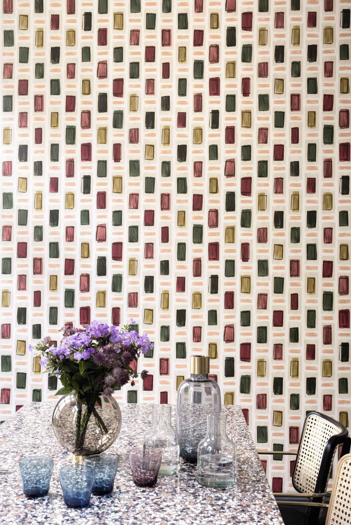 Wzór dość figlarny - szalone prostokąty, całościowo tworzy spójną grafikę, która w jakiś sposób uspokaja wnętrze i działa kojąco. Pokazana w kontrastowych, mocnych i żywych kolorach pobudza naszą wyobraźnię.