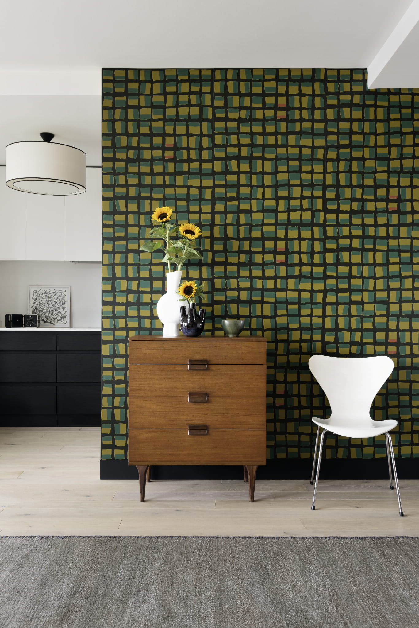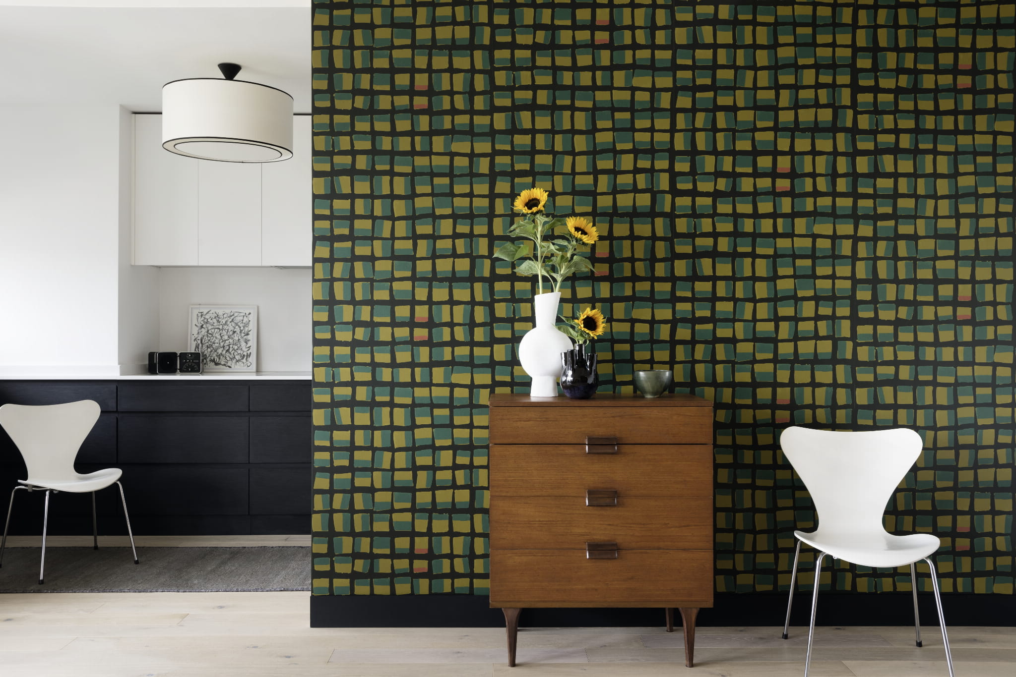 Wzór dość figlarny, szalone kwadraciki, całościowo tworzy spójną grafikę, która w jakiś sposób uspokaja wnętrze i działa kojąco. Pokazana w kontrastowych, mocnych i żywych kolorach pobudza naszą wyobraźnię.