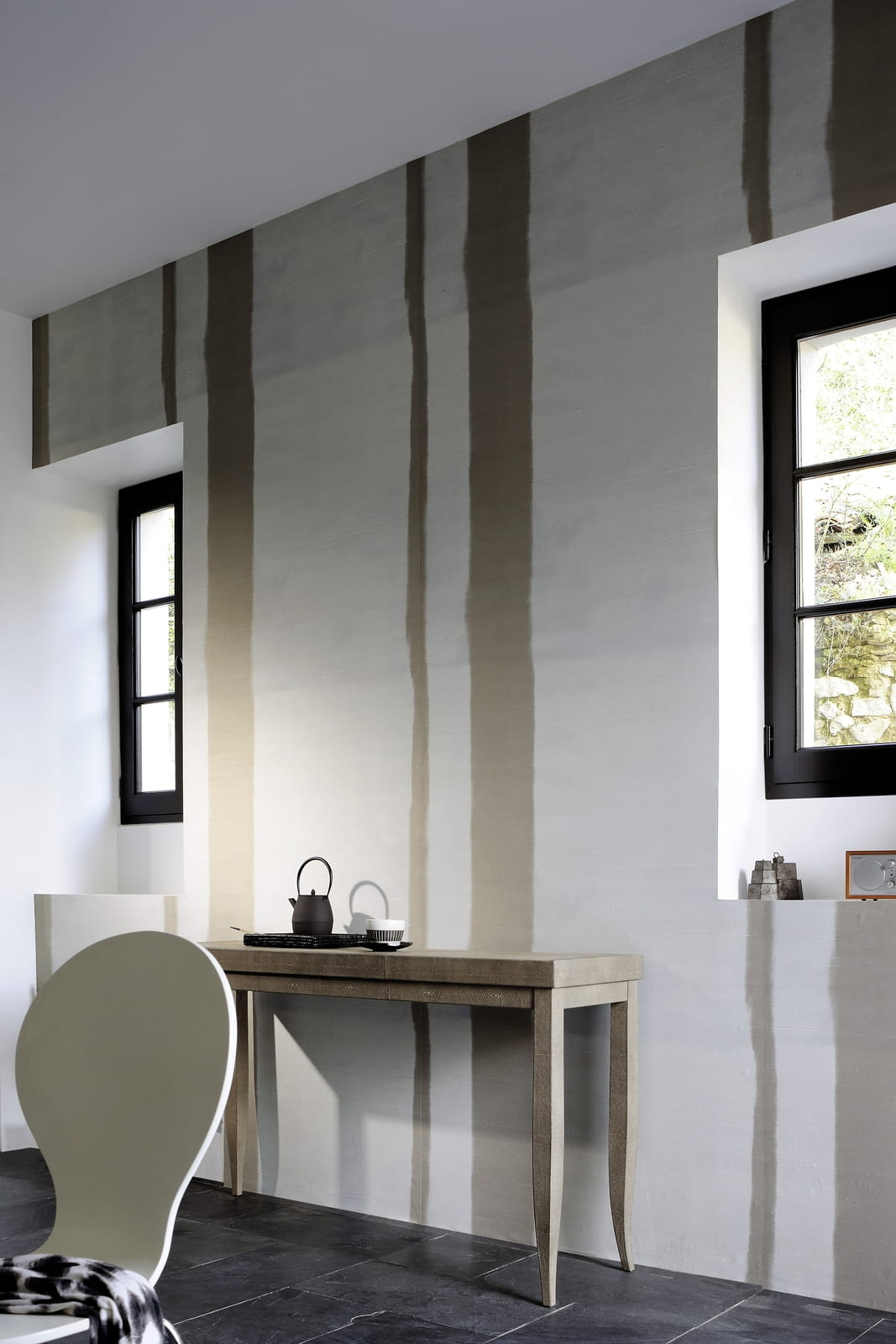 Tapeta winylowa o strukturze jedwabnej surówki w pionowe, szerokie, nieregularne pasy - naturalna, elegancka, zaskakująca.