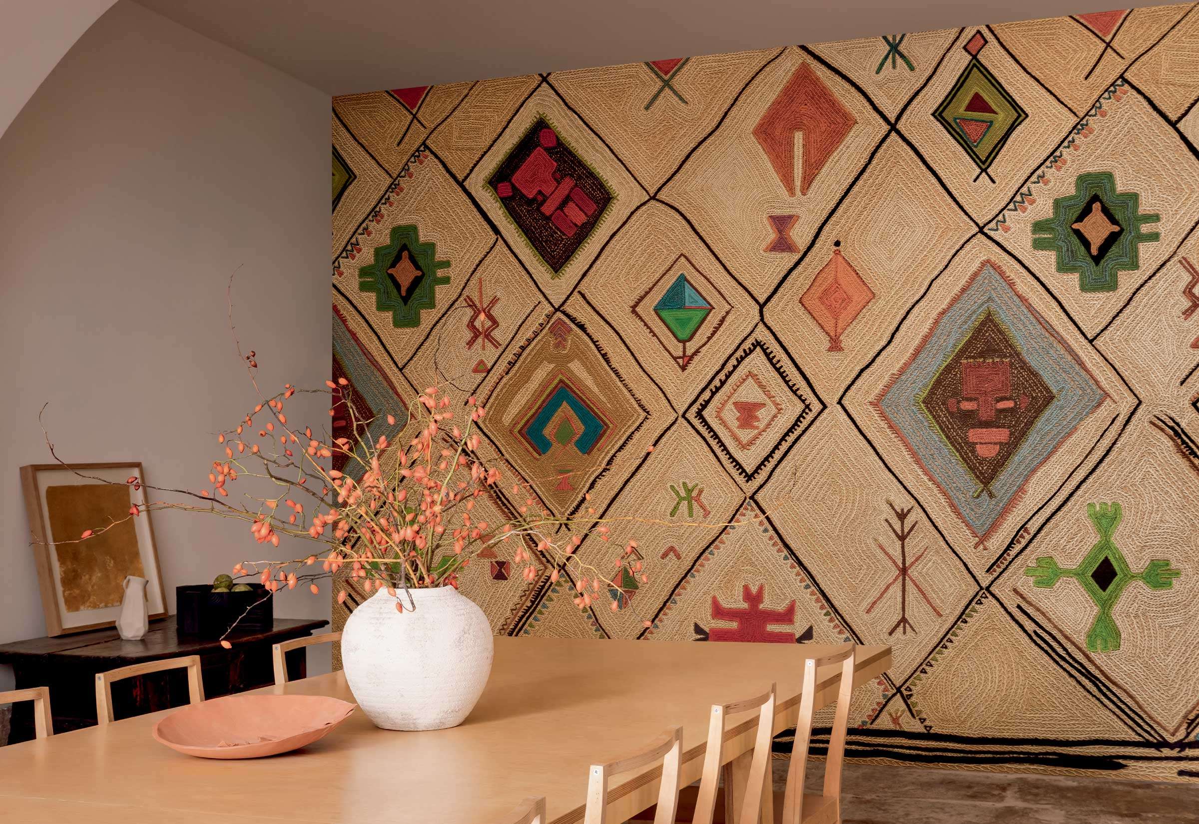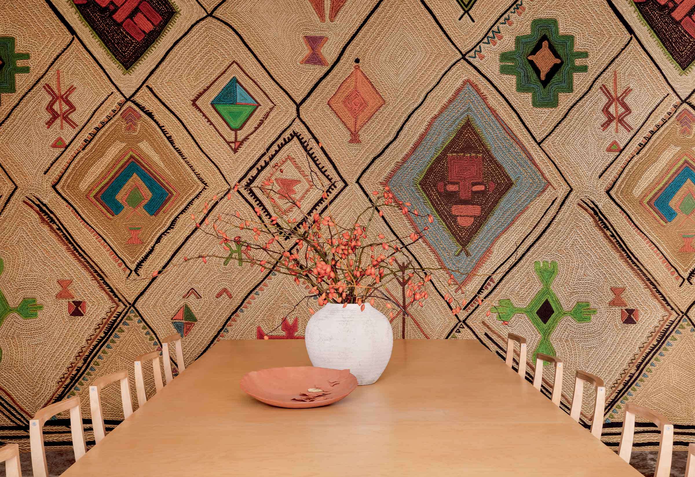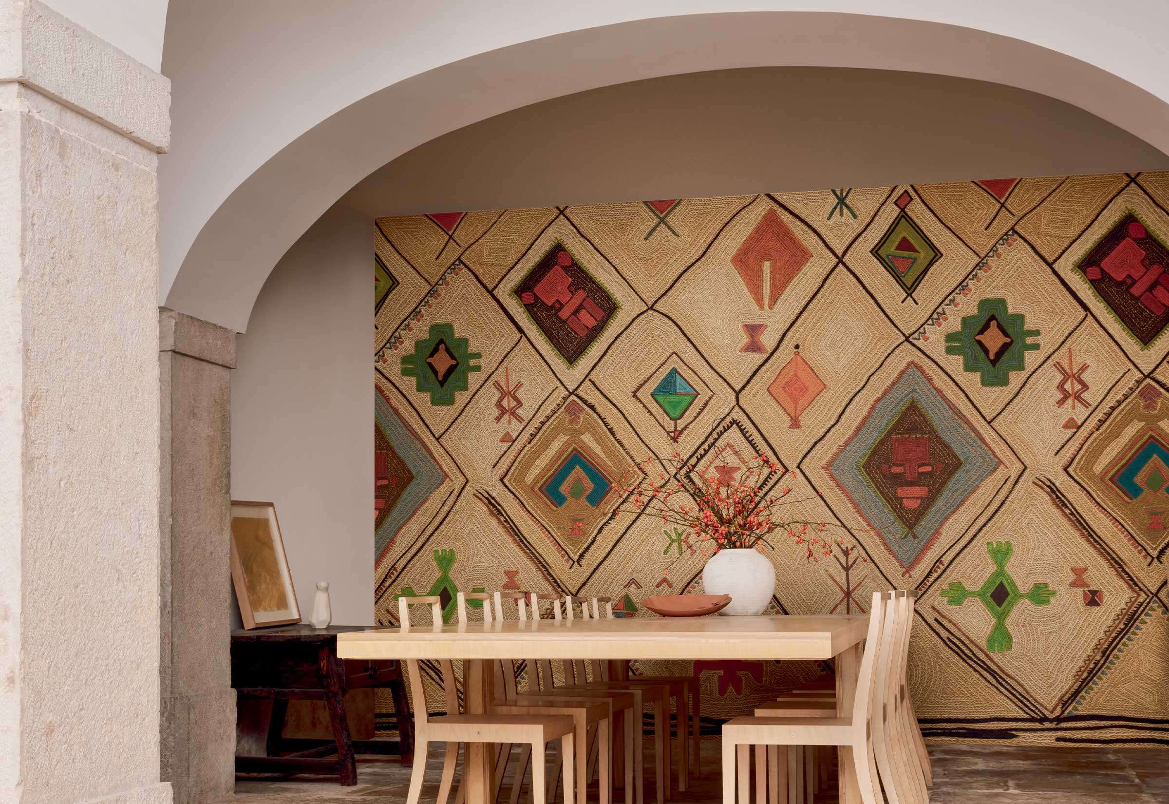 Tapeta tworzy efekt ręcznie tkanego płótna z subtelnym haftem, który ożywia powierzchnię ściany, nie dominując przestrzeni.