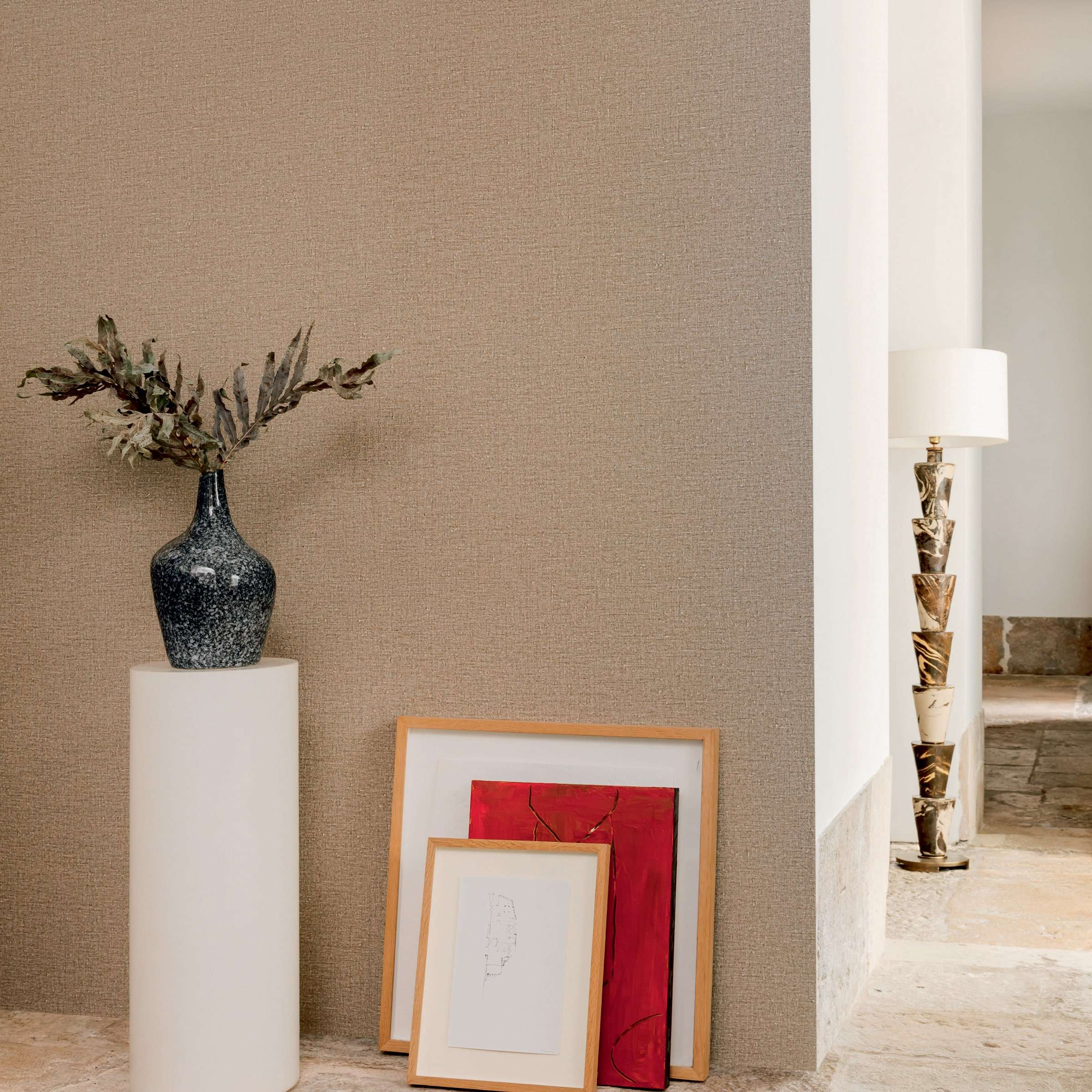 Struktura tapety jest matowa, wyraźnie fakturowana, o miękkim dotyku i subtelnym splocie. Tapeta daje efekt spokojnej głębi i nowoczesnej elegancji, jednocześnie pozostając bardzo naturalna w odbiorze.