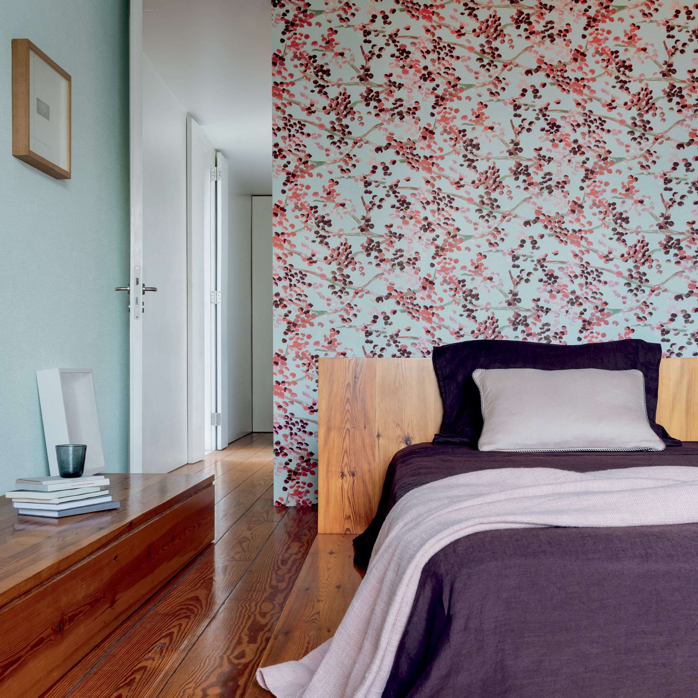 Tapeta tworzy delikatne, świetliste tło, które nie dominuje, lecz podkreśla charakter wnętrza.
