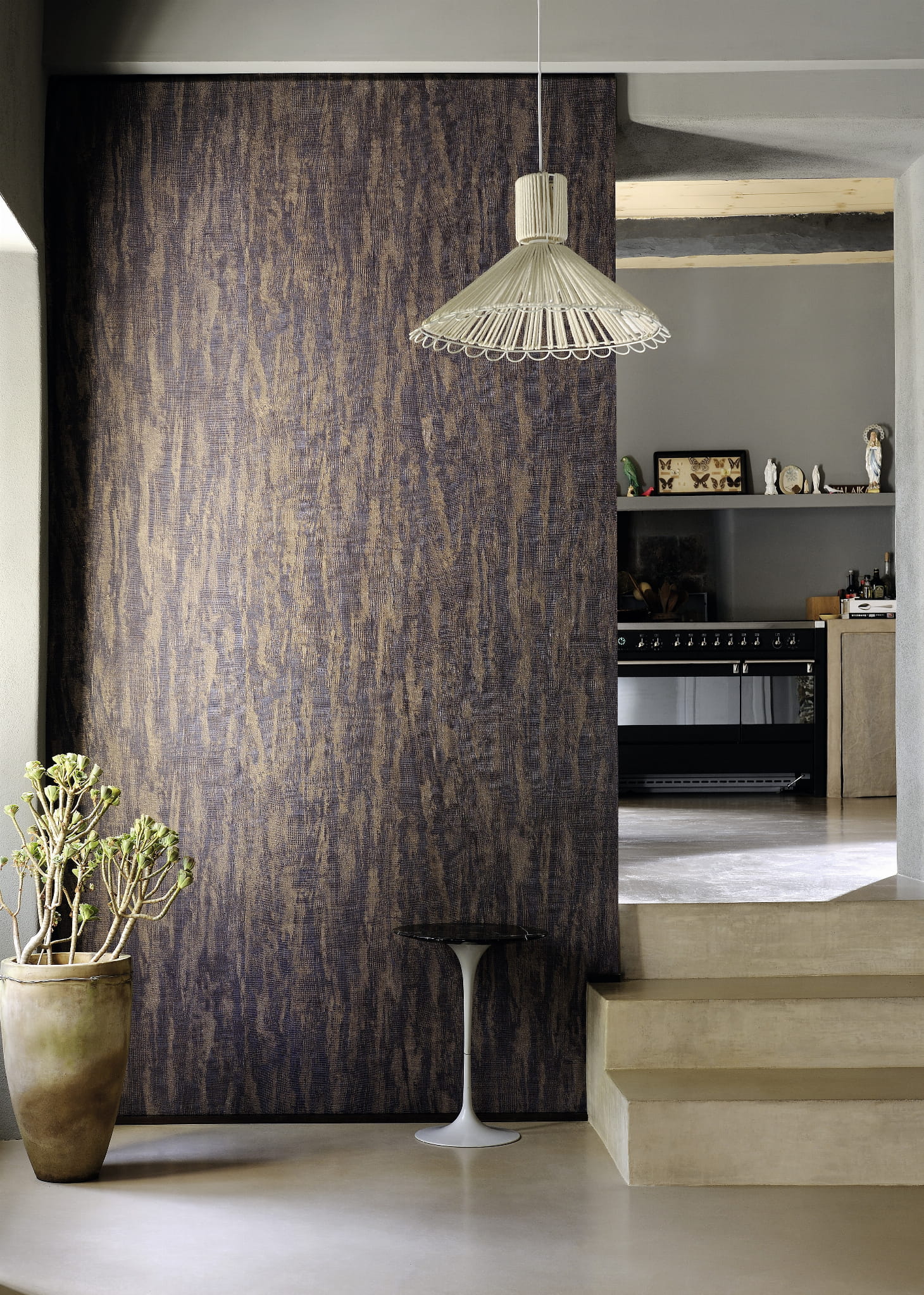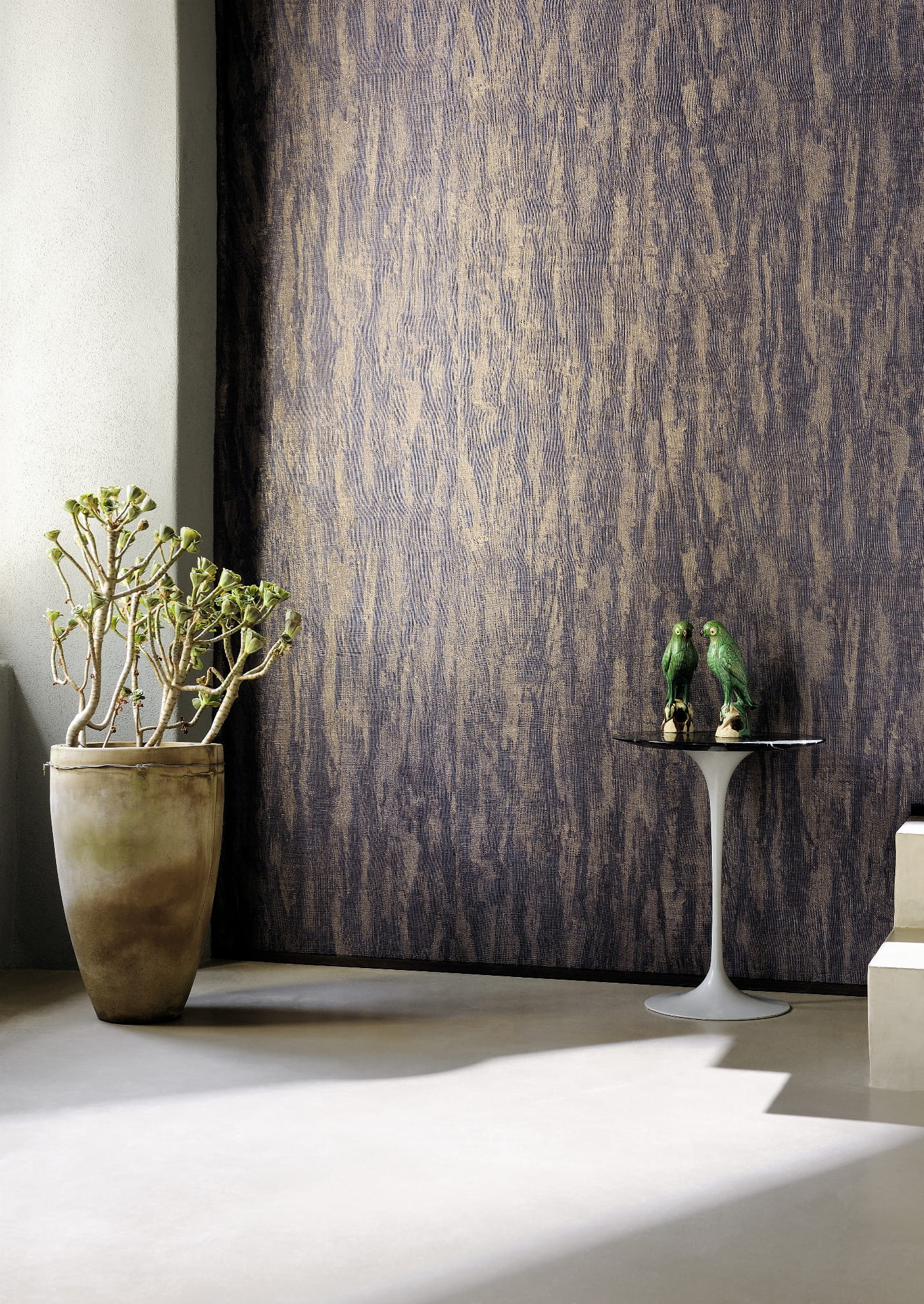 Zdumiewająca struktura tkaniny, wykonana tak precyzyjnie, że trzeba jej dotknąć aby uwierzyć! Przetarcia, pionowe, potęgują jej naturalny efekt tworząc coś na wzór tynków strukturalnych jednak dużo cieplejszych, naturalnych i organicznych W zależności od koloru tapeta pozwala na osiągnięcie różnych efektów stylistycznych. Tapeta występuje również w wersji z zatopionymi drobinkami metali, co działa magicznie z grą światła, tworząc efekt wypukły, połyskujący wręcz opalizujący.