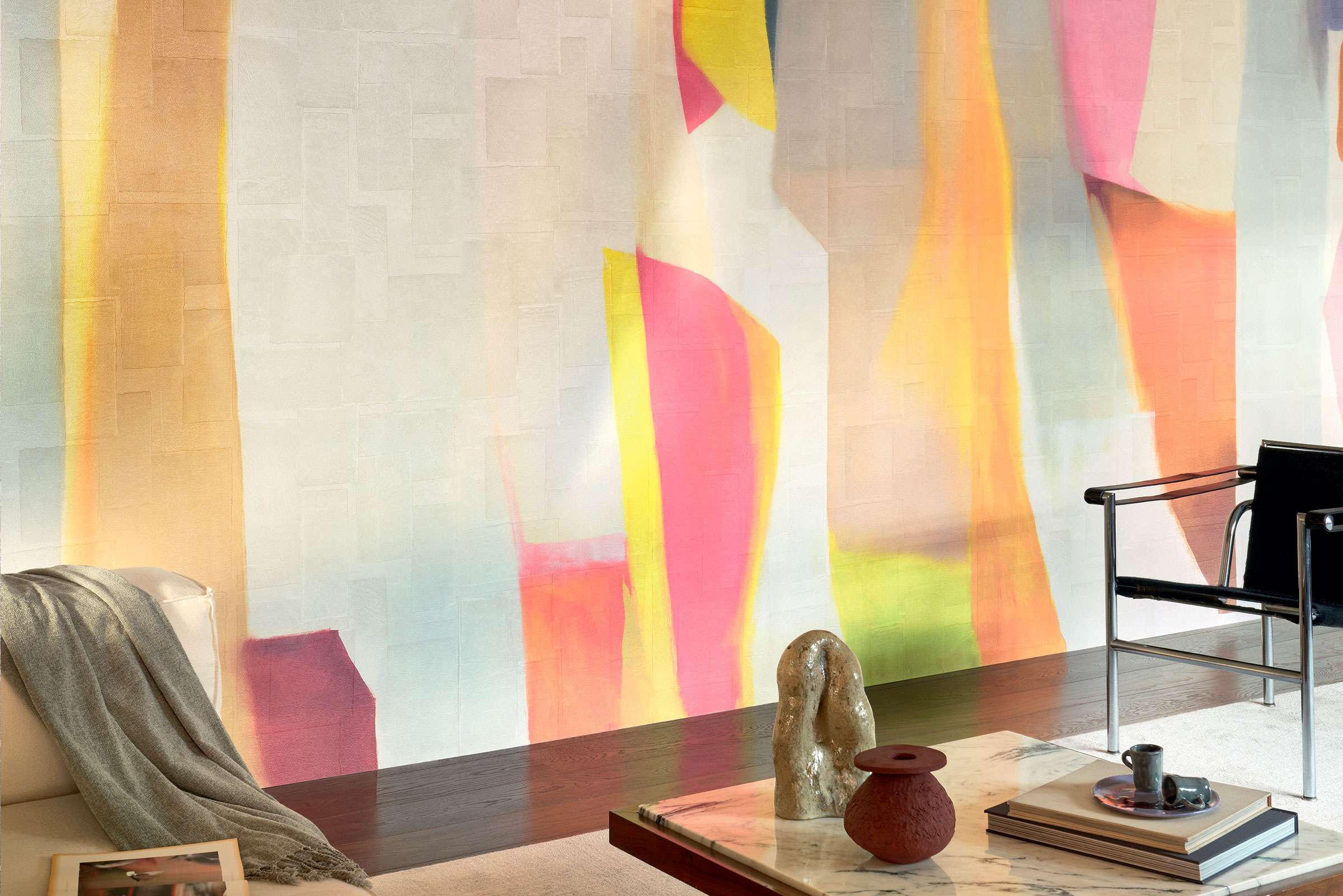 Tapeta panoramiczna (mural) Aspirations fusionnelles to artystyczna kompozycja z kolekcji Sangpi. Wzór przypomina malarską abstrakcję – delikatne przejścia barw, miękkie gradienty i organiczne formy tworzą wrażenie subtelnego ruchu i głębi. Inspiracją jest ręcznie barwiony papier oraz tradycyjne techniki japońskie, którym kolekcja zawdzięcza swoją nazwę (Sangpi oznacza papier z włókien morwy).