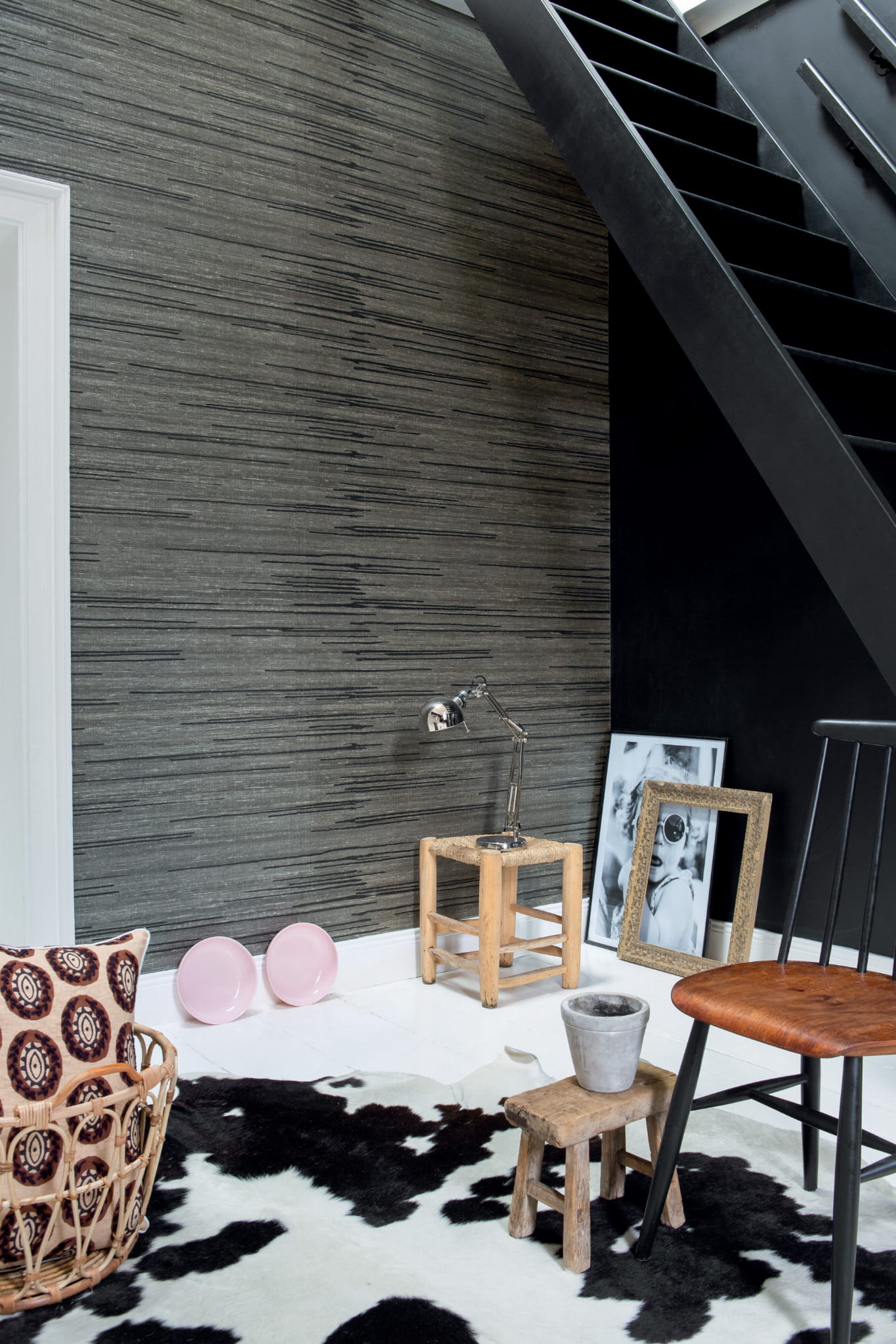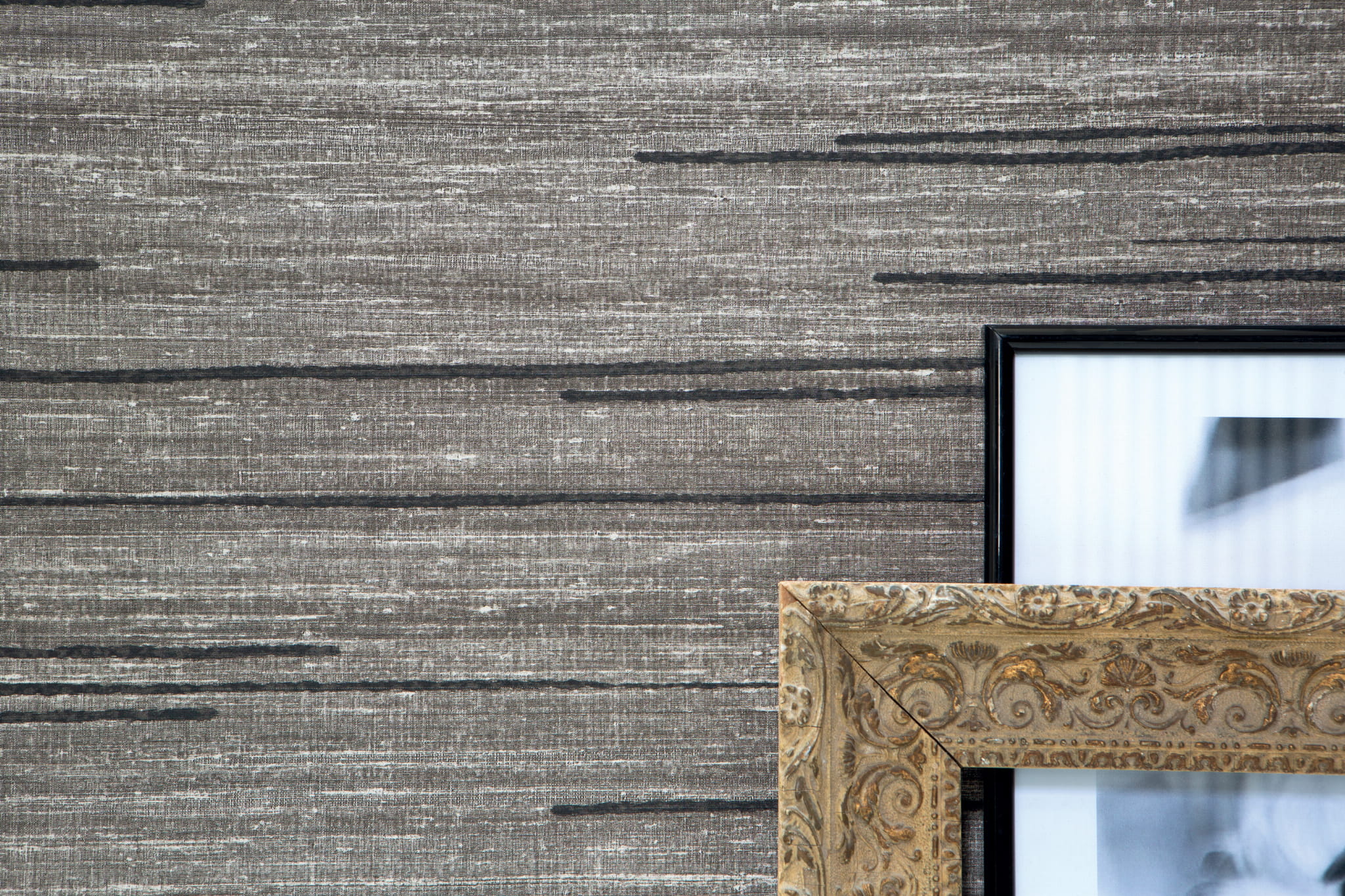 Tu pokazujemy wariant Kari charakteryzujący się wzorem nieregularnych poziomych linii, które wyglądają, jak dodatkowe stebnowania, hafty czy malunki. Interpretacja dowolna. Tapeta w kolorze czarnym.