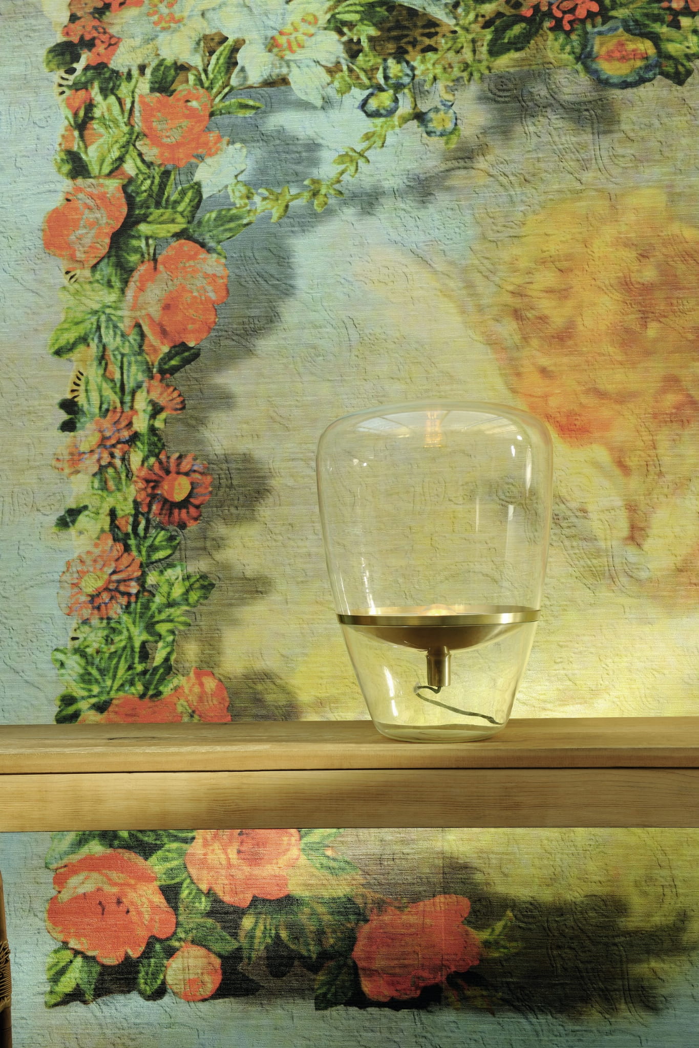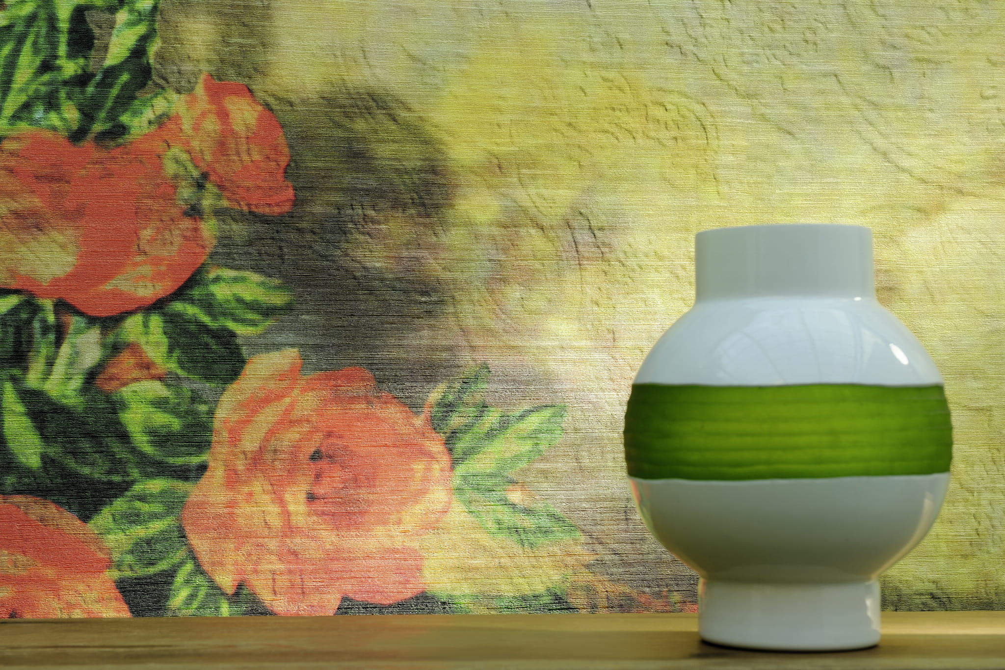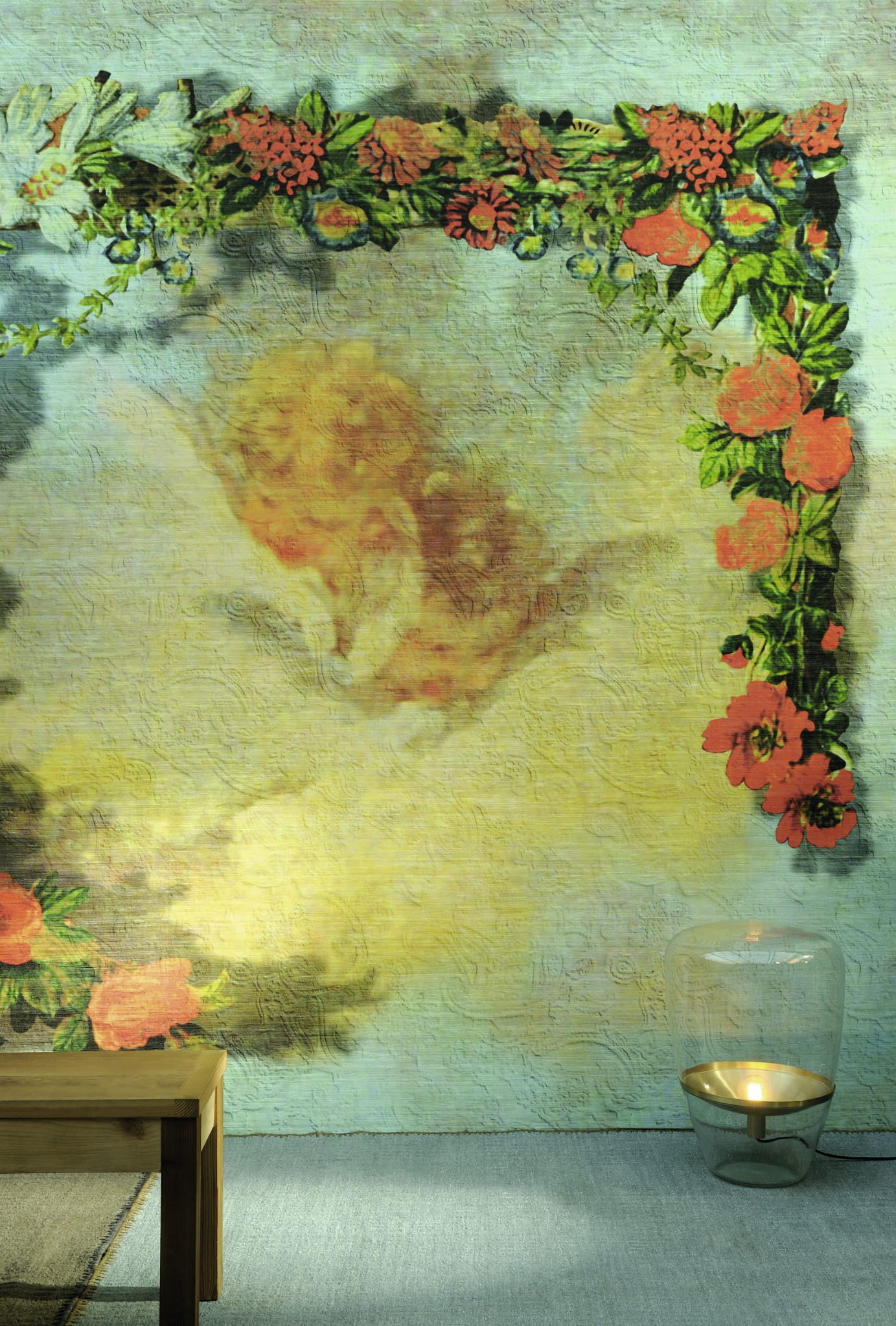 Tapeta o strukturze delikatnej, lekko połyskującej, szlachetnej tkaniny. Struktura udekorowana jest dodatkowo grafiką zaplanowaną na ścianę o szer. 400cm i maksymalnej wysokości 300cm. Szerokość grafiki można kontynuować za pomocą dodatkowo zamawianych pasów gładkiej struktury lub wzorem.