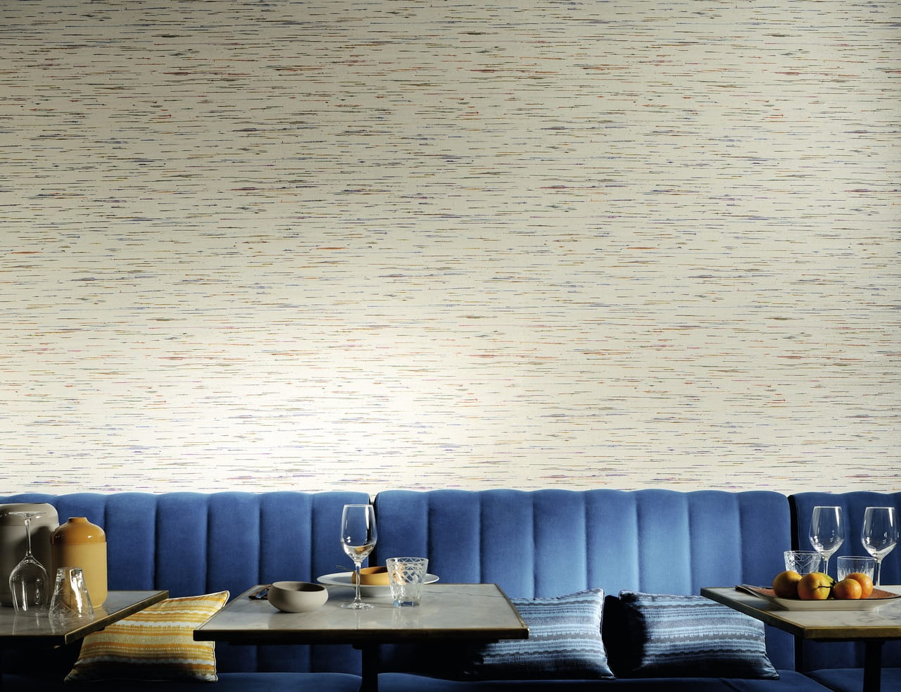 Tapeta o strukturze delikatnej, lekko połyskującej, szlachetnej tkaniny. Struktura przypomina cieniusieńką niedokładną pliskę, biegnącą poziomo, która jest podkreślona przez wplecione kontrastowe nitki. Jak zwykle Elitis komponuje kolory zjawiskowo i niezwykle oryginalnie. Kolory są skomponowane tak, że ten interesujący i niespotykanemu efekt na ścianie łatwo przenieść do całego wnętrza dobierając pozostałe elementy. To właśnie precyzyjna komunikacja kolorystyczna różnych detali wnętrza, od dużych mebli, po akcesoria, czyni je świadomie zaprojektowanym.