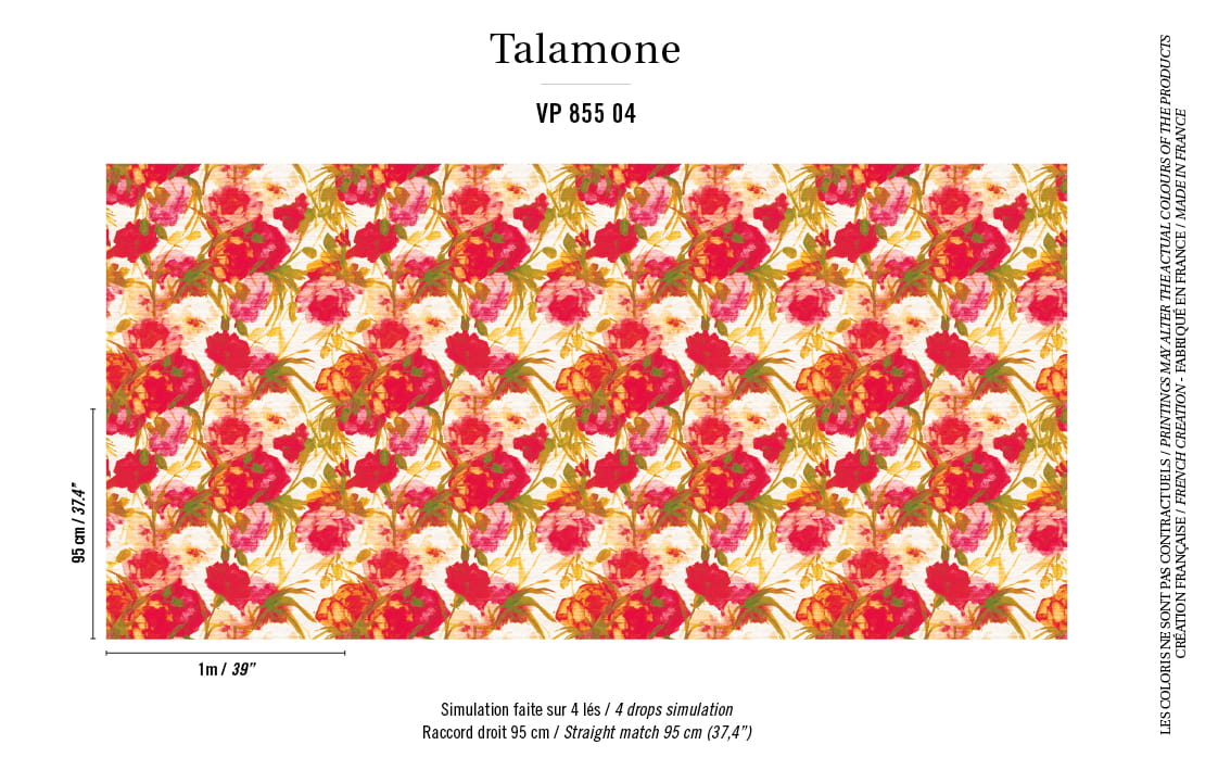 Struktura delikatnej, lekko połyskującej, szlachetnej tkaniny przypomina cieniusieńką niedokładną pliskę, biegnącą poziomo, która jest bazą dla bogatego kwiecistego nadruku. Jak zwykle Elitis komponuje kolory zjawiskowo i niezwykle oryginalnie. W zależności od wariantu tapeta wydaje się być klasycznie delikatną bądź nowocześnie charakterną.